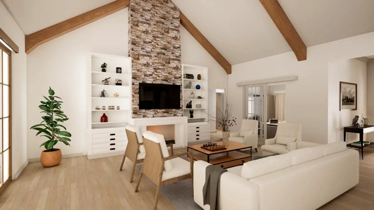 Stepping inside, the home opens into a vaulted great room that forms the heart of the living space. The ceiling volume here enhances light and spatial openness, creating a central hub that feels both grand and inviting.