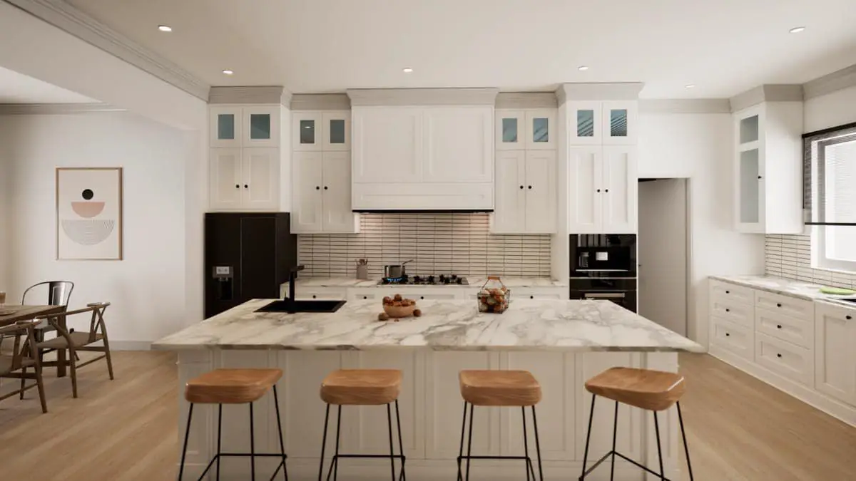 - Large kitchen island for meal prep, casual dining, and social engagement.