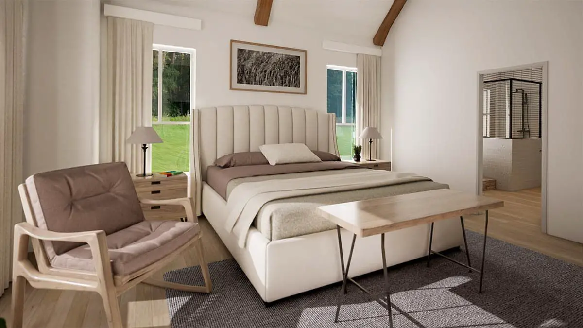 These rooms share access to full bathroom amenities, ensuring comfort and convenience without interrupting main shared areas. The thoughtful bedroom arrangement maintains privacy while preserving the home’s efficient flow.
