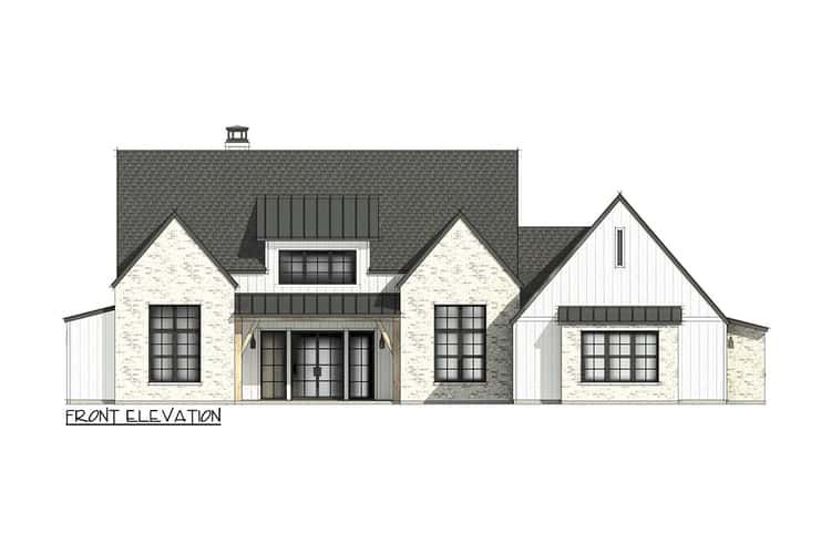 This transitional farmhouse plan delivers approximately 2,854 sq ft of thoughtful one-story living space that blends classic farmhouse character with modern open-plan functionality, vaulted interior volumes, and strong indoor-outdoor connections.