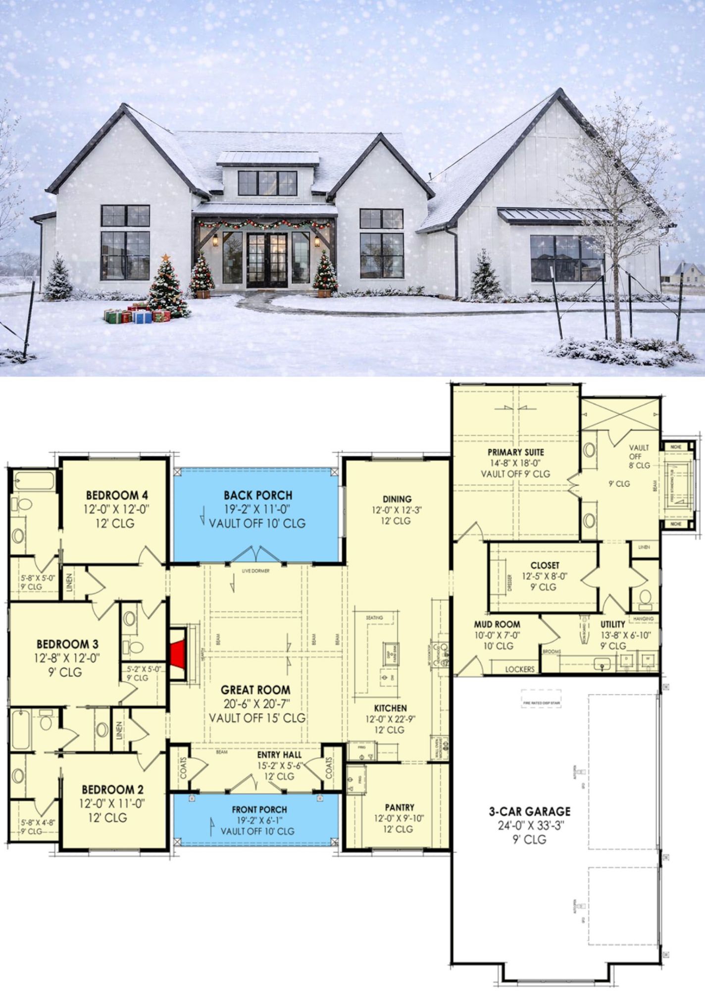 This transitional farmhouse plan thoughtfully combines **expansive vaulted shared spaces, private bedroom retreats, organized functional zones, and indoor-outdoor connectivity**. Its smart circulation, abundant natural light, and adaptable layout make it ideal for families who value comfort, interaction, and timeless architectural appeal in a well-balanced, thoughtfully detailed home.