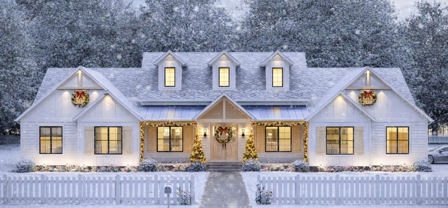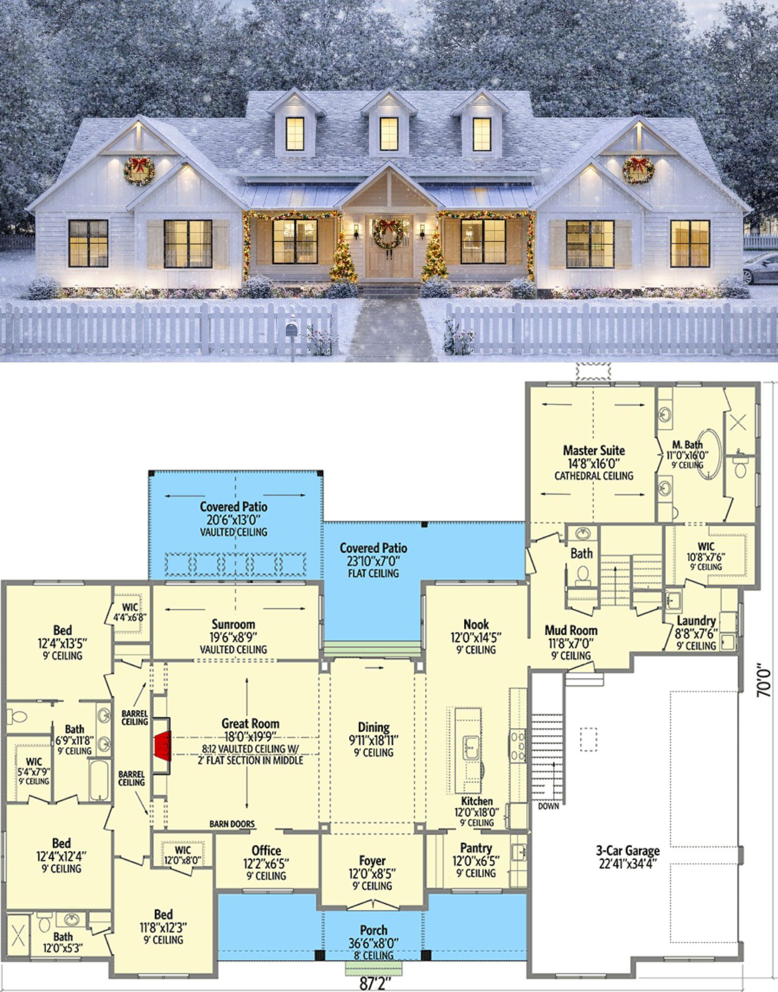 With a symmetrical façade, vaulted great room, open shared spaces, private bedroom wings, and smart circulation throughout, this design blends timeless farmhouse charm with functional living that supports both daily needs and entertaining.