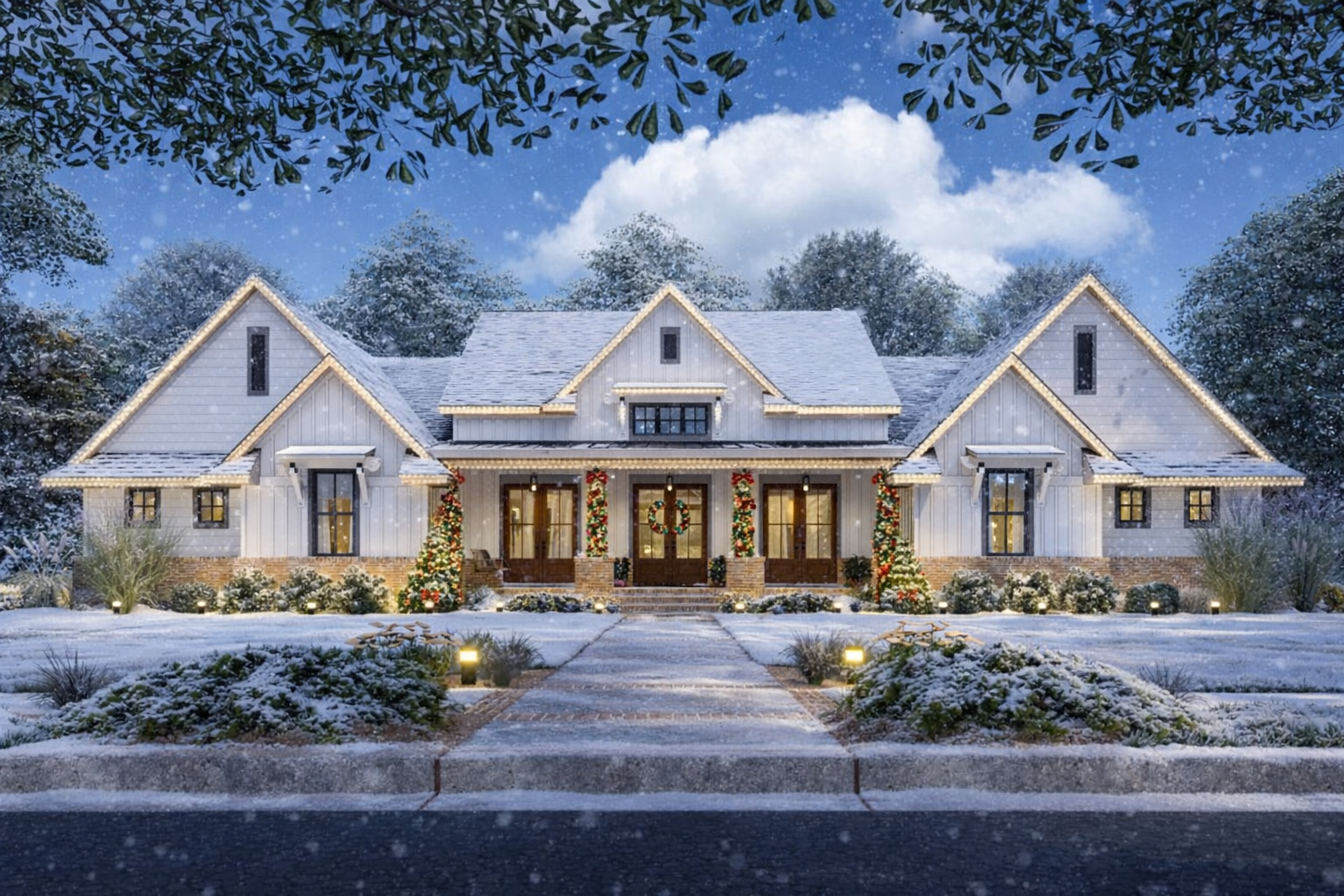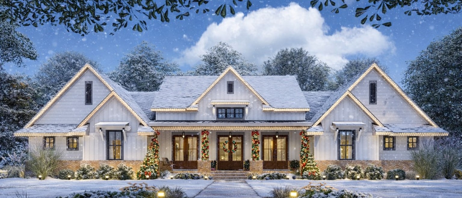This modern farmhouse plan delivers approximately 3,077 sq ft of thoughtfully organized living space that blends classic farmhouse character with contemporary open-plan living and abundant outdoor connectivity.