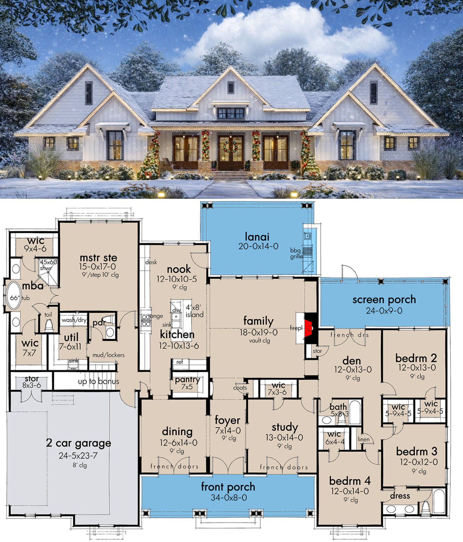From the exterior, this farmhouse design exhibits timeless appeal with balanced proportions, clean rooflines, and classic farmhouse detailing. A wide covered **front porch** creates an inviting outdoor room that sets the tone for daily use and social interaction.