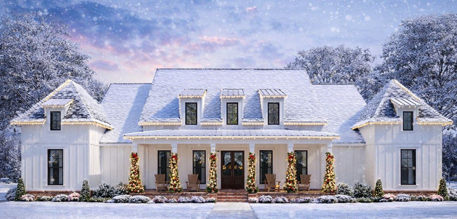 The exterior strikes a classic farmhouse silhouette with balanced rooflines, clean siding details, and well-proportioned windows that enhance curb appeal and usher natural light into the home.