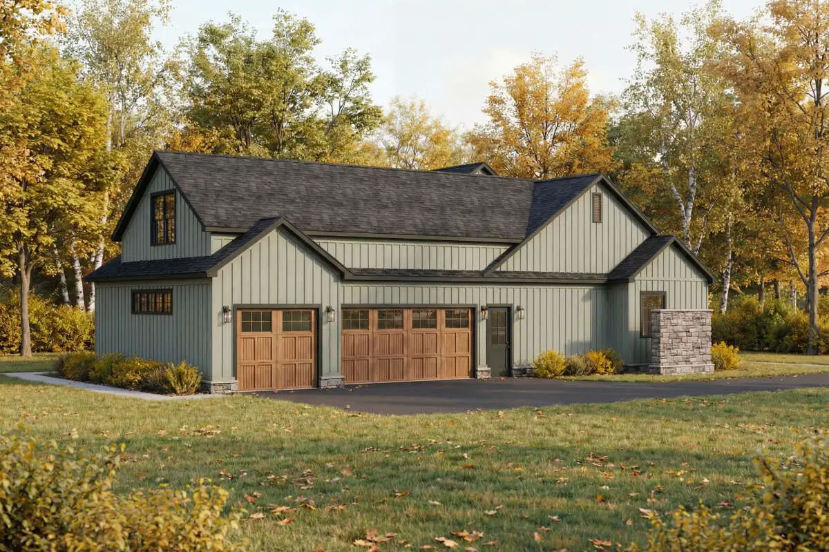 Simple rooflines and well-proportioned windows contribute to timeless farmhouse charm, while the side-entry three-car garage keeps the street view neat and enhances practical access for vehicles and storage. The exterior materials and detailing lend a warm, inviting presence suitable for rural, suburban, or countryside settings.