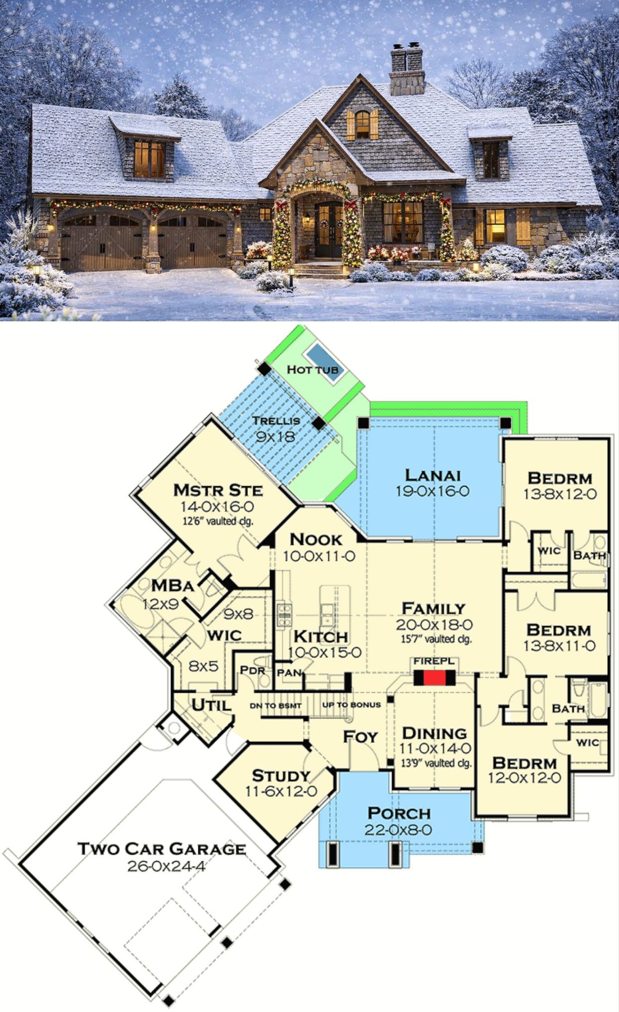 With a central vaulted great room, a flexible bonus room above, multiple outdoor living zones including a covered lanai, and thoughtful private bedroom placement, this design supports family living, entertaining, and everyday comfort.