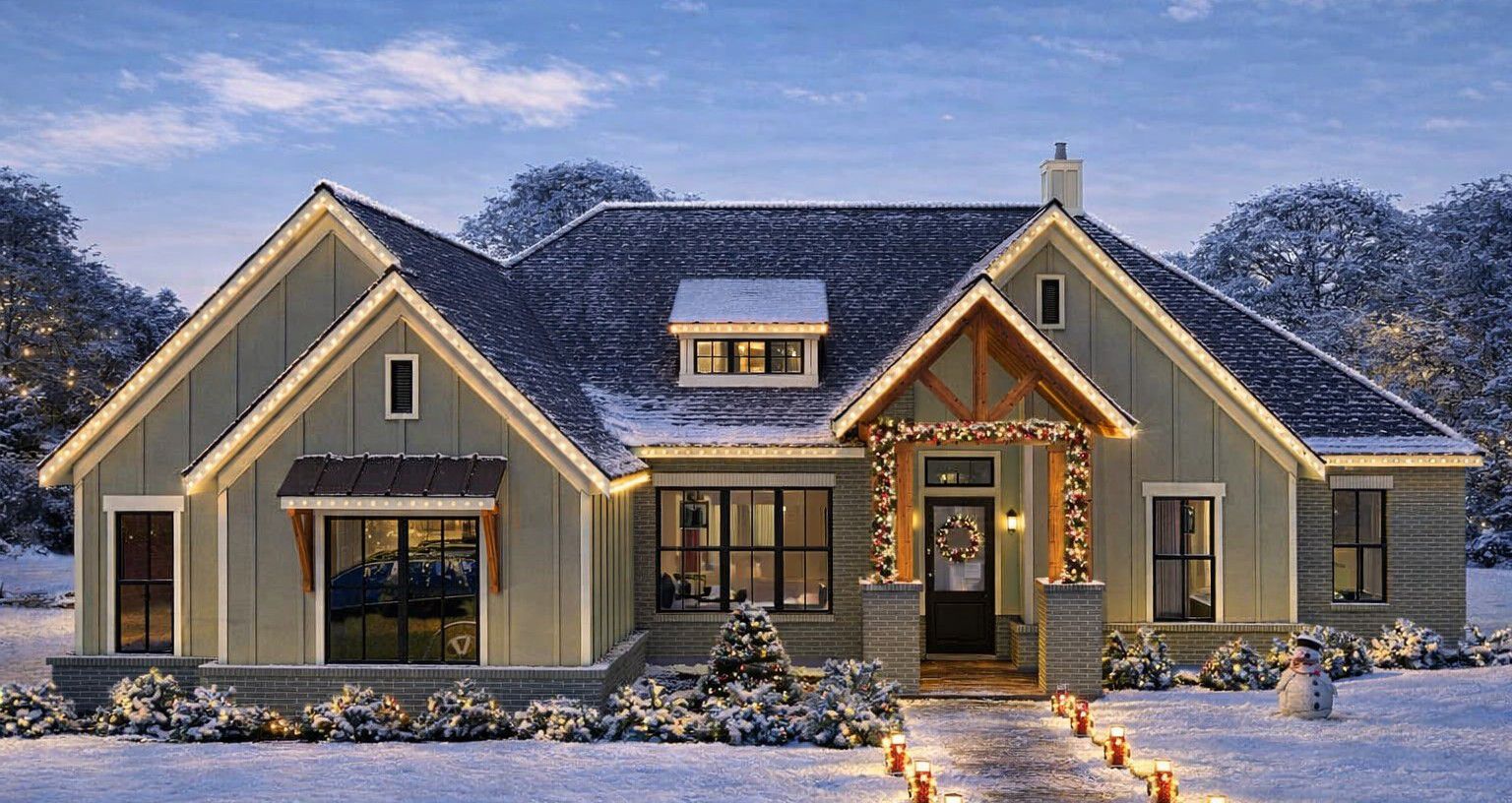 The exterior of this ranch design reflects a timeless aesthetic with balanced proportions, varied rooflines, and generous windows that bring natural light into the home.