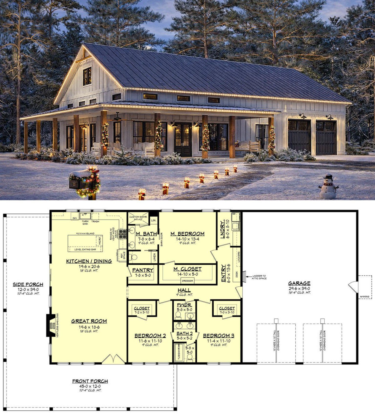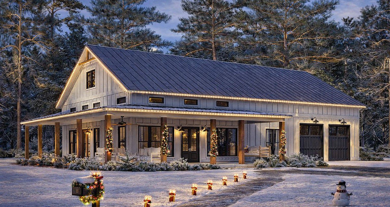 A covered front entry and potential wrap-around porch create welcoming outdoor seating zones that enhance everyday comfort and expand usable space into the outdoors. The oversized attached garage also serves as a workshop or storage area, adding a practical dimension that aligns with the barndominium ethos of blending living space with utility.