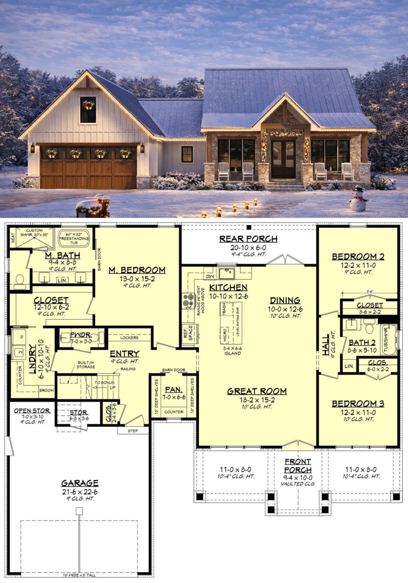 This modern farmhouse plan delivers approximately 1,793 sq ft of smartly organized, single-story living space that blends efficient design with contemporary farmhouse character. The layout includes 3 bedrooms, 2 full bathrooms + 1 half bath, and an attached 2-car garage (~534 sq ft).