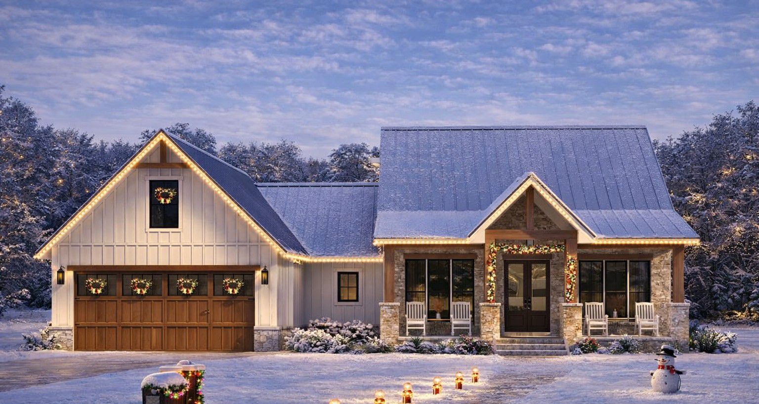 At around 60′-6″ wide and 53′-10″ deep, the proportions are modest but purposeful — presenting a welcoming presence that works well on a range of lot sizes. Wide windows help frame the façade while bringing abundant natural light into the interior shared spaces.