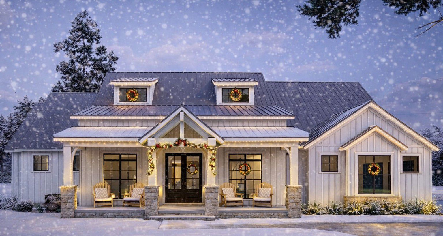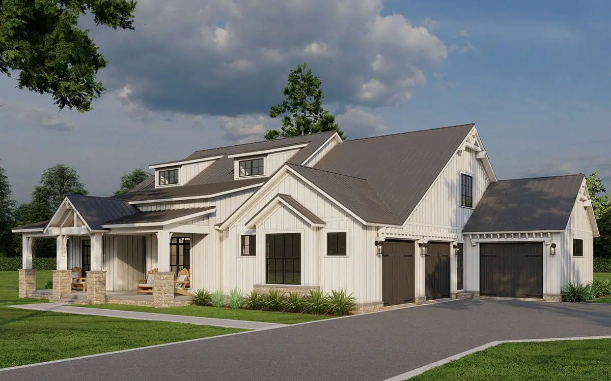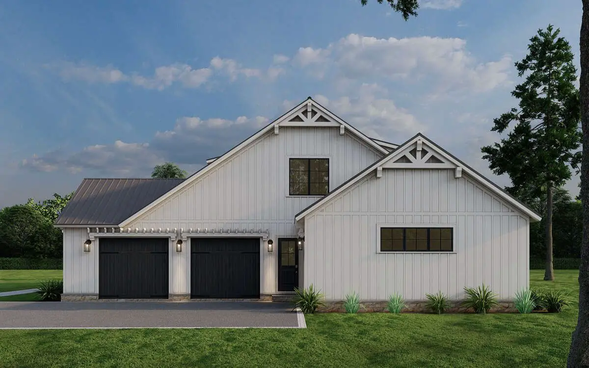 The exterior presents a timeless modern farmhouse aesthetic with clean board-and-batten siding, large windows, and a welcoming front porch that gives the home a strong yet inviting presence. Its balanced façade draws the eye with simple, elegant details that feel both fresh and classic.