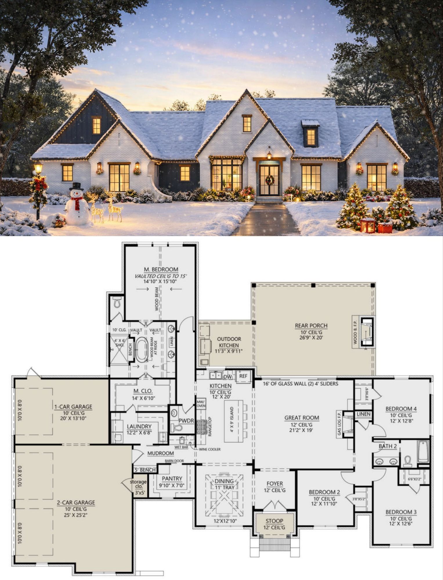 This stunning one-story European house plan offers about 2,674 square feet of beautifully arranged living space with 4 bedrooms, 2 full bathrooms, and 1 half bath. Designed with timeless architectural details and modern comforts, it’s perfect for families who want a refined look paired with everyday functionality.