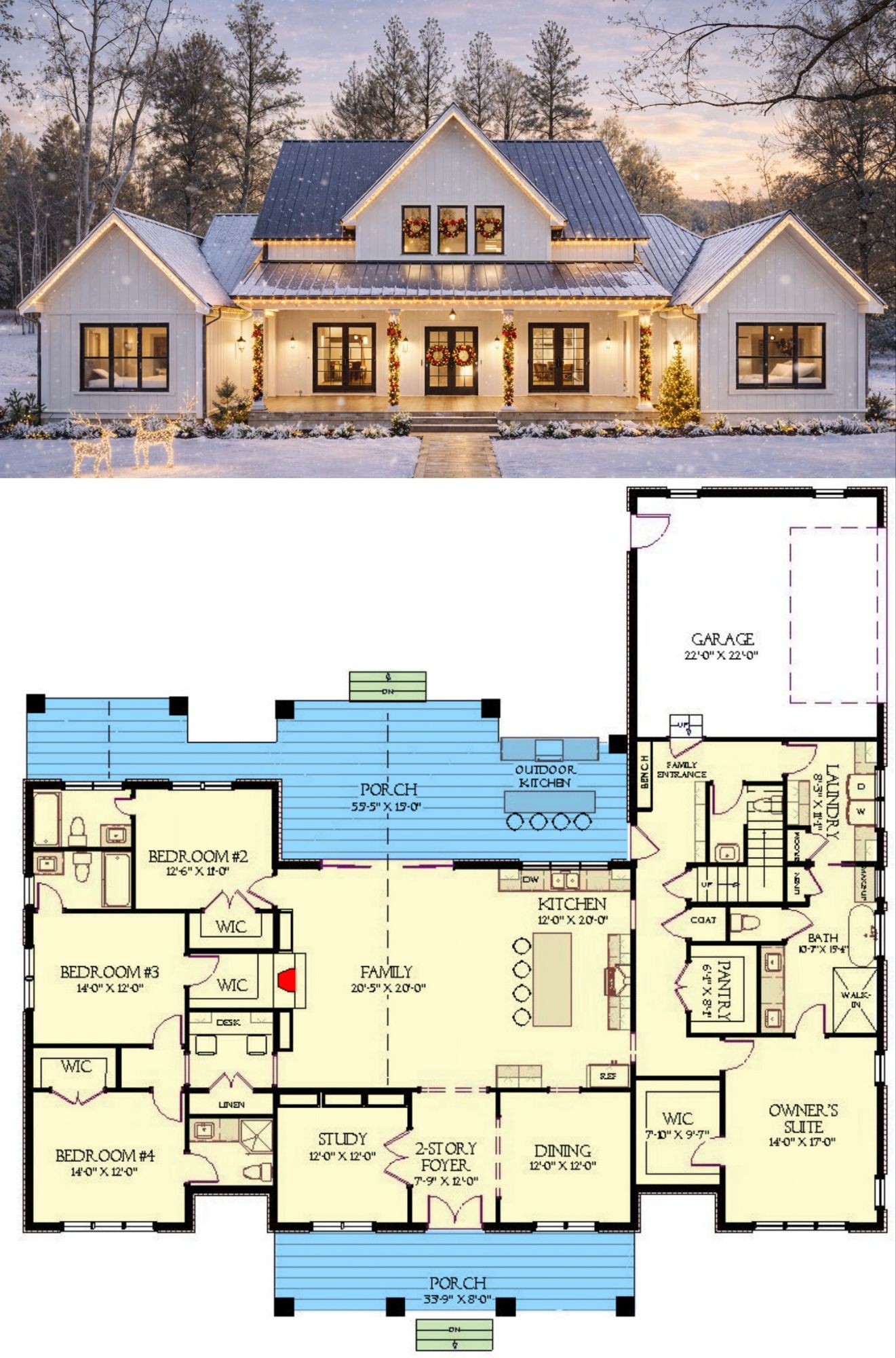 Based on typical U.S. construction cost averages for homes of this size and complexity, building this modern farmhouse generally ranges around $650,000 to $825,000 USD, depending on location, material choices, site conditions, and finish levels. Personalized cost-to-build reports can help refine your project budget. 29