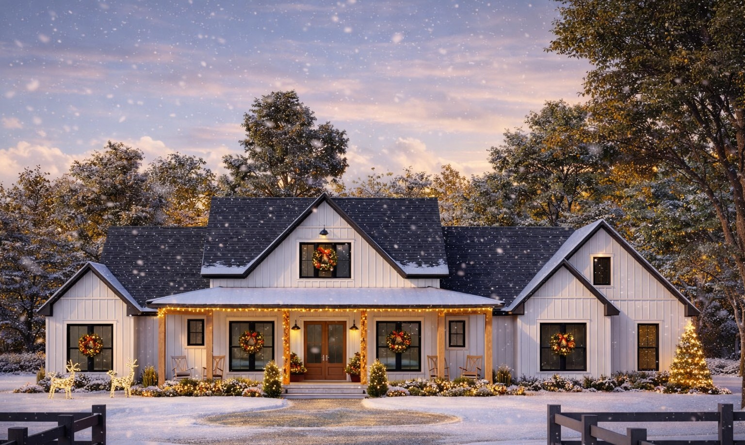 The exterior celebrates classic modern farmhouse aesthetics with clean lines, balanced proportions, and a welcoming front porch (~403 sq ft). The side-load garage (~802 sq ft) preserves a clean façade while providing ample space for vehicles and storage.