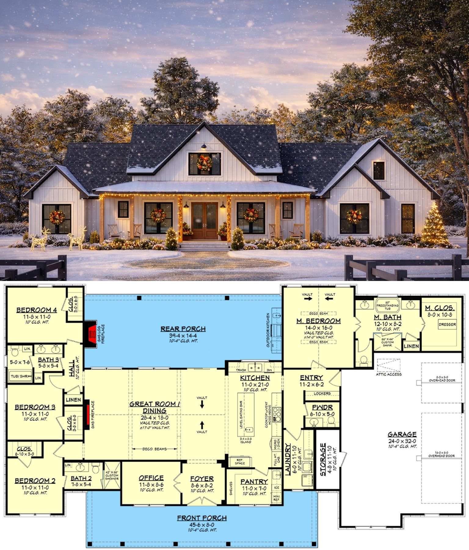 This modern farmhouse plan is crafted for comfortable everyday living and memorable gatherings. The open living spaces keep family members connected, while the split bedroom layout offers privacy where it’s needed most. A dedicated office gives you a focused workspace at home, and generous outdoor living areas with a kitchen and fireplace expand your usable square footage — perfect for both relaxation and entertaining.