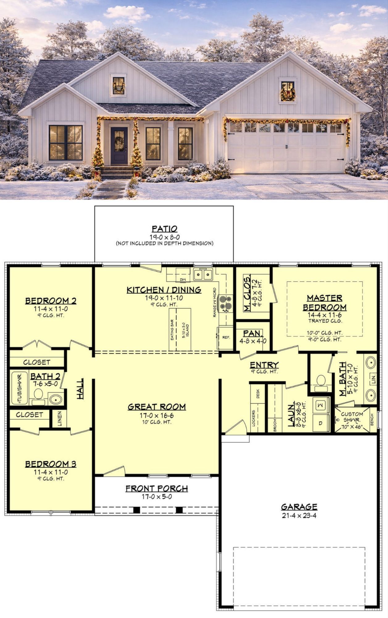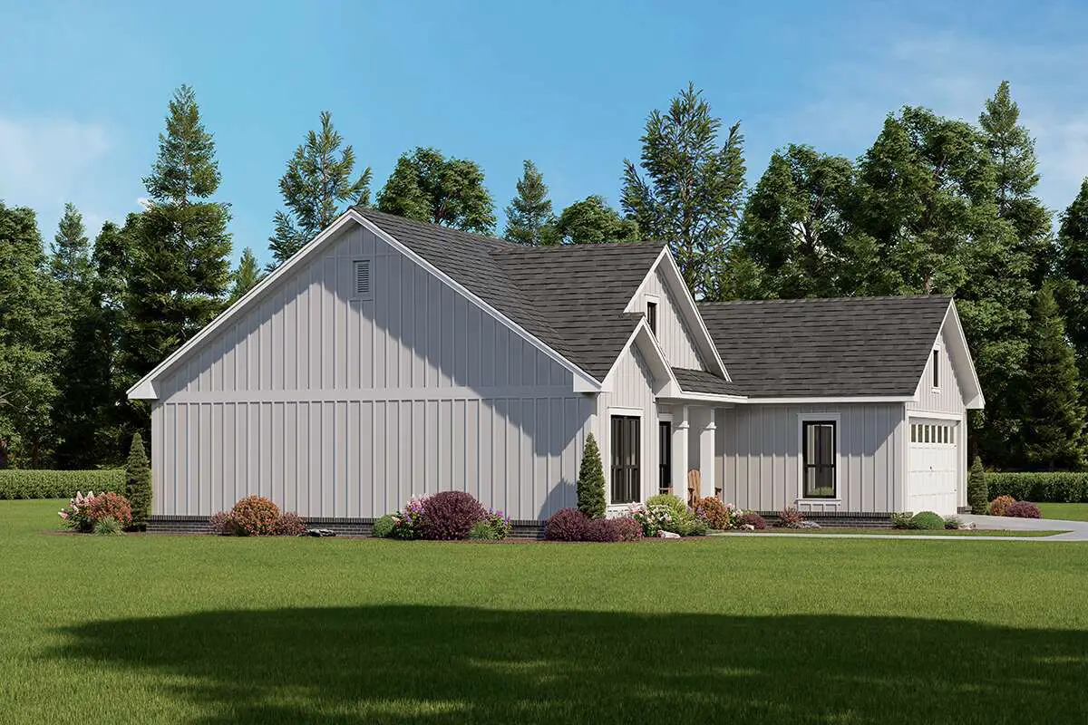 This inviting modern farmhouse plan delivers about 1,416 square feet of heated living space with a comfortable single-story layout, featuring 3 bedrooms, 2 full bathrooms, and a 2-car front-entry garage.