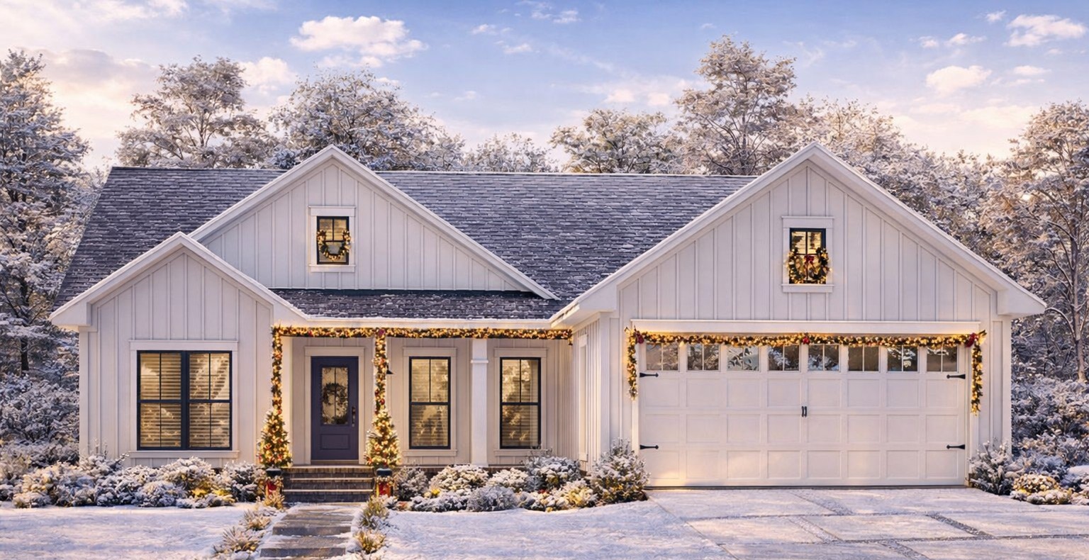 The attached 2-car garage (≈519 sq ft unheated) sits at the front for convenient access while maintaining the home’s clean farmhouse façade.