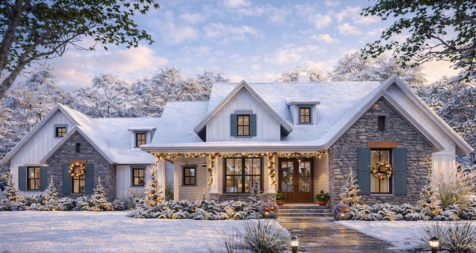 The exterior showcases modern farmhouse characteristics like clean lines, upright gables, mixed siding textures, and an inviting covered front entry. With dimensions around 80′ 3″ wide by 56′ 3″ deep, the layout sits comfortably on many lots and integrates porch spaces that extend your living outdoors.