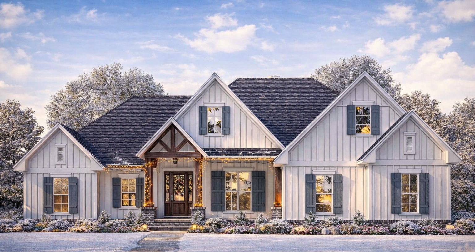 The home’s exterior blends New American style with modern farmhouse touches, typically featuring board-and-batten or mixed siding with brick or stone accents and architectural roof details that give it attractive curb appeal. A covered front porch invites outdoor seating, and a rear porch extends usable living space outdoors.