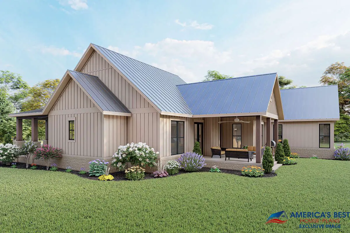 The exterior blends classic farmhouse character with modern design touches — think mixed siding, timber accents, and a welcoming front porch that expresses timeless curb appeal. At about 76′ wide by 70′-8″ deep, this home has a presence that fits nicely on many suburban or rural lots while giving plenty of outdoor living space.