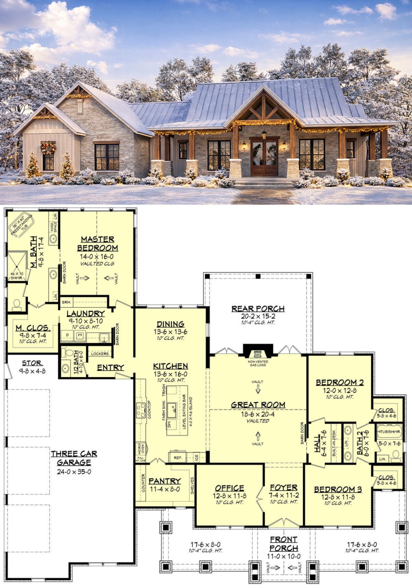 This modern farmhouse plan is built for comfortable everyday living and gracious entertaining. The open floor plan keeps family members connected, while vaulted ceilings and the fireplace add architectural interest. Separate sleeping areas, study space, and smart utility placements make routines easier, and generous porch areas extend your usable space for outdoor relaxation. 18