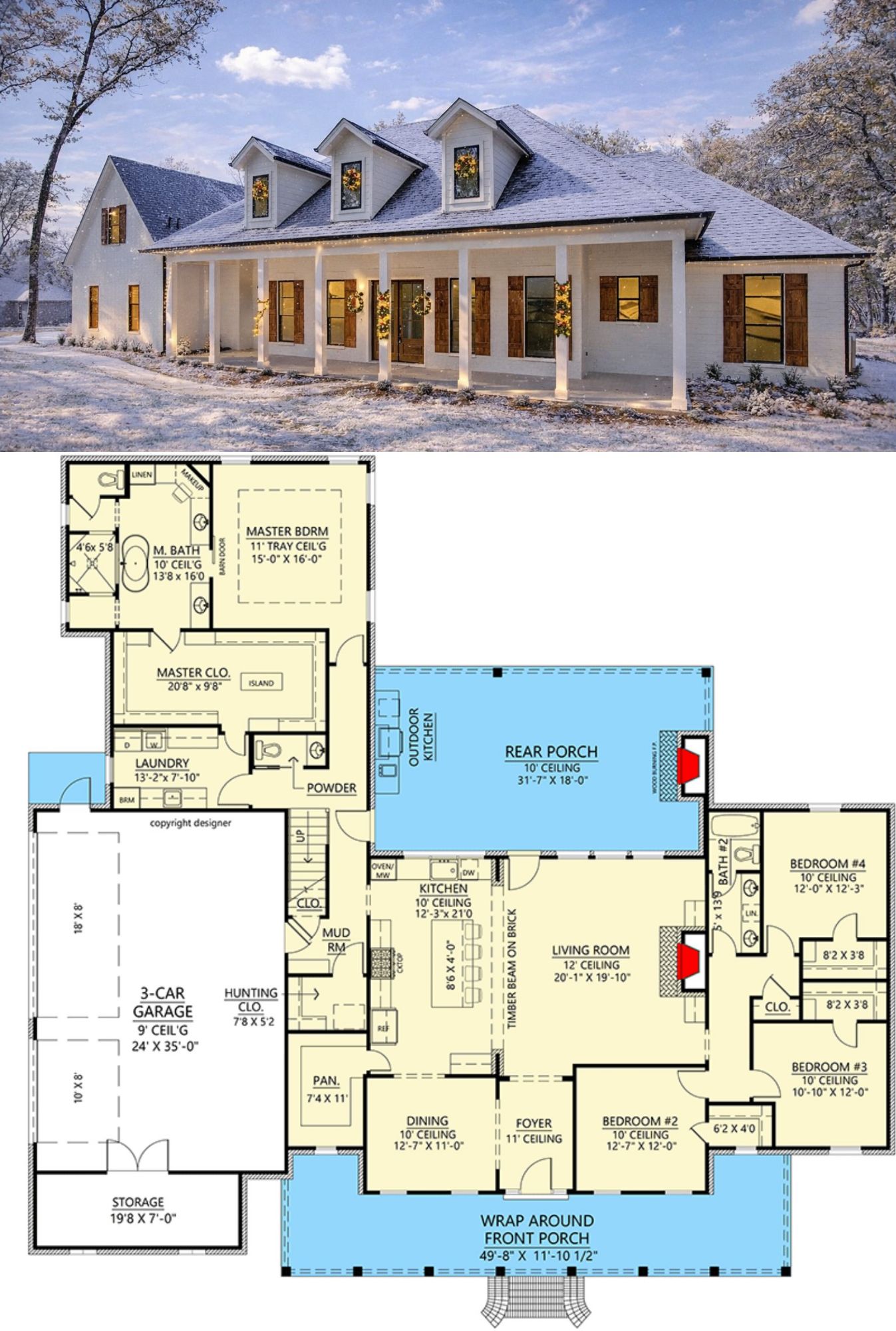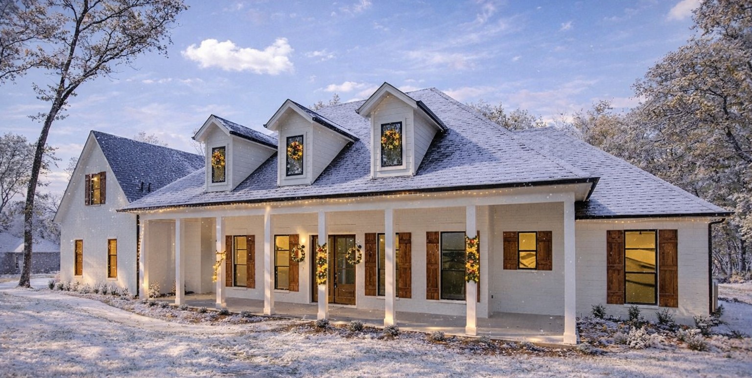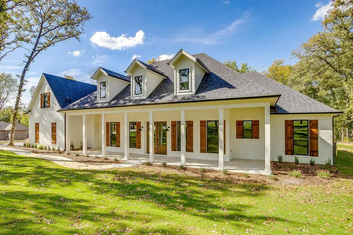 The style blends modern farmhouse charm with country and craftsman influences for broad appeal.