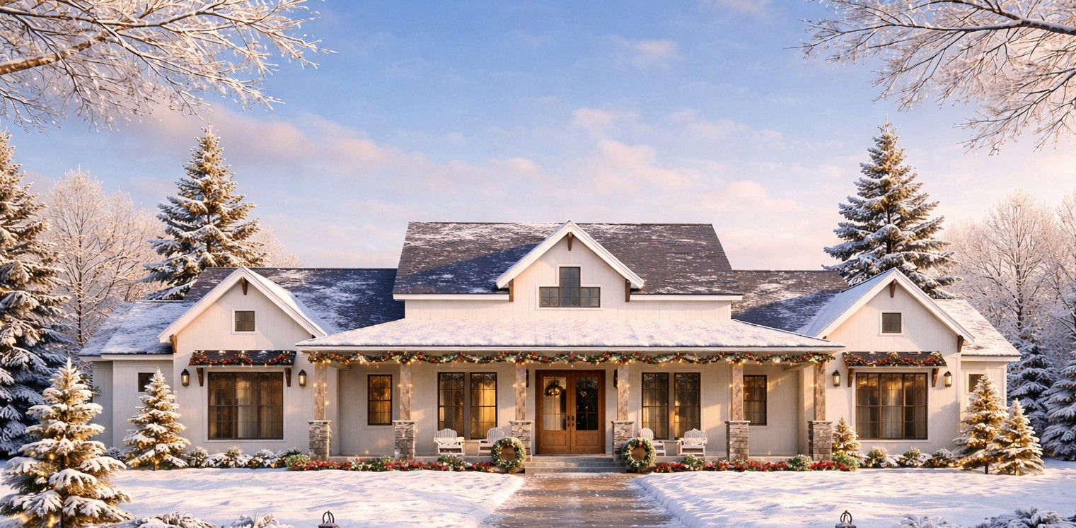 The exterior speaks to modern farmhouse charm with crisp siding, stone accents, and a covered front porch supported by timber posts on stone bases.