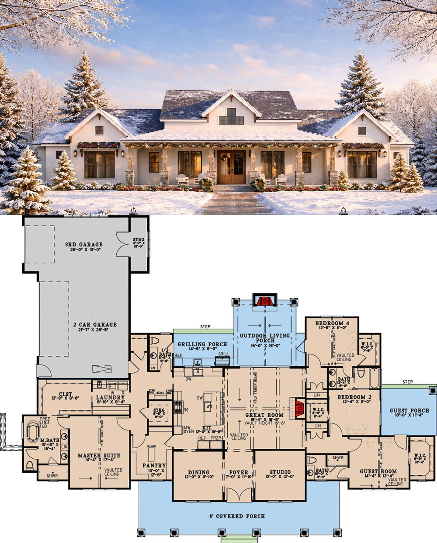 Step inside to an open foyer flanked by a formal dining room on one side and a versatile studio or office on the other — ideal for remote work, a playroom, or a hobby room. The two-story great room with a fireplace and exposed beams provides a welcoming heart of the home, seamlessly connecting to the kitchen and back porch.