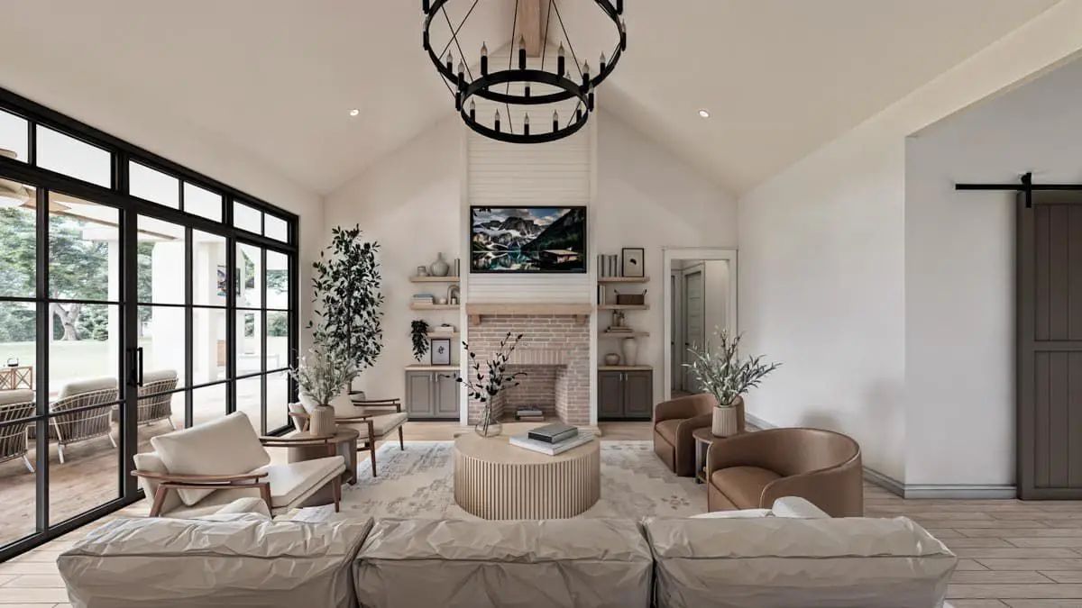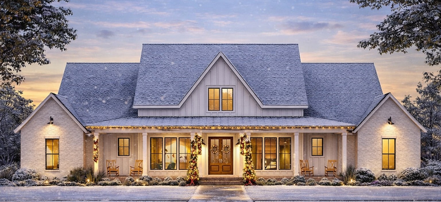 The exterior of this plan embraces modern farmhouse aesthetics with a **symmetrical design**, a welcoming *wrap-around porch*, and mixed materials that might include board-and-batten siding and stone accents — all contributing to timeless curb appeal and a strong first impression.