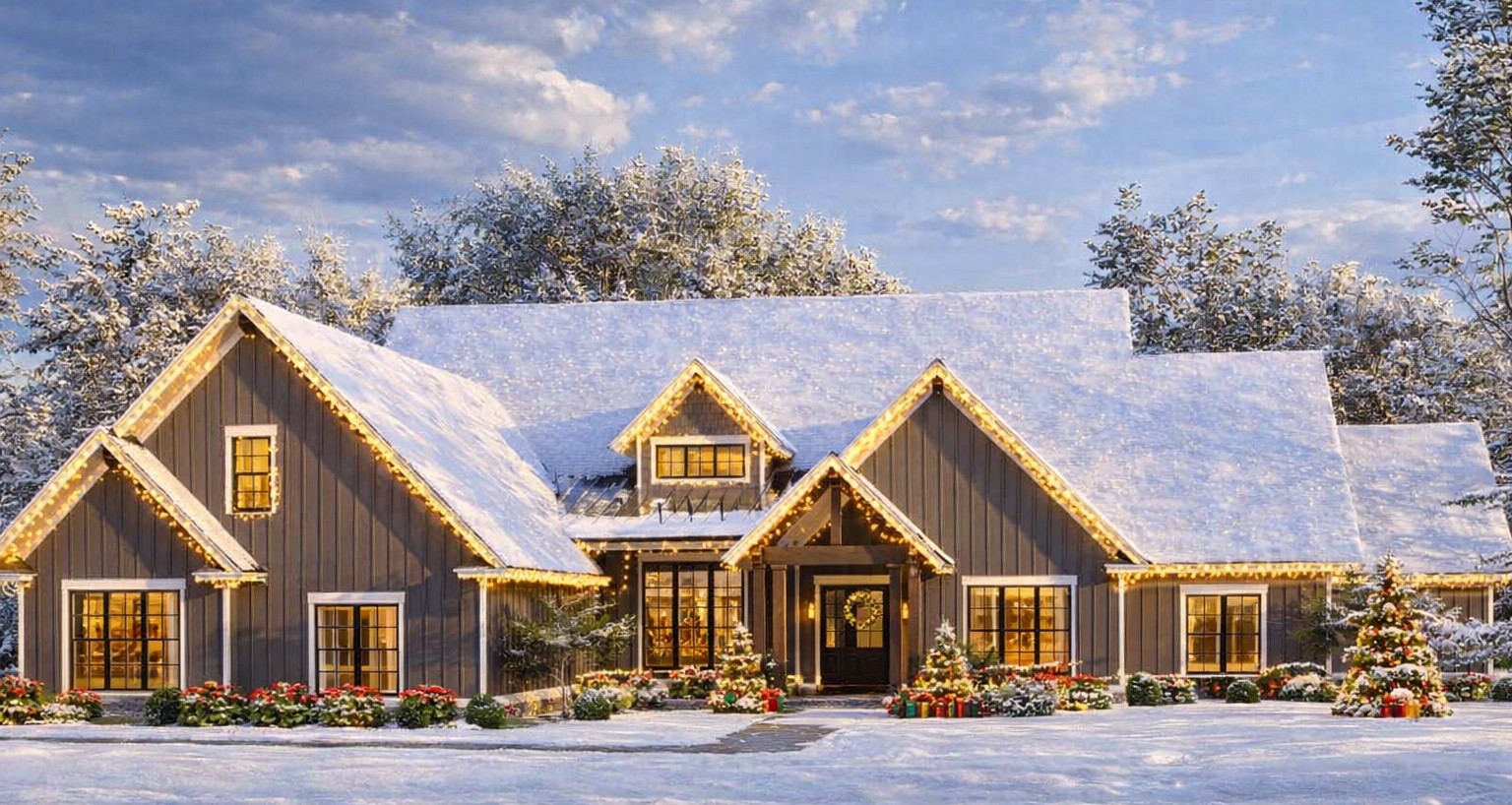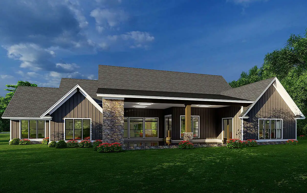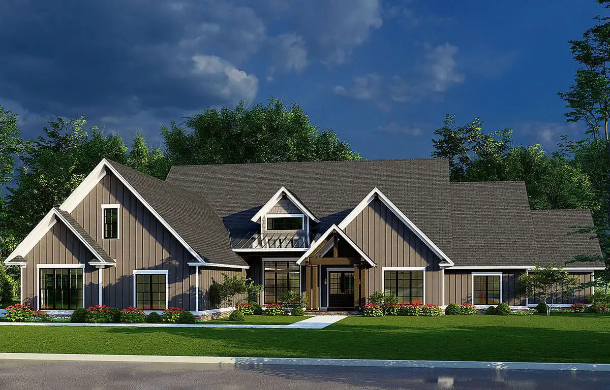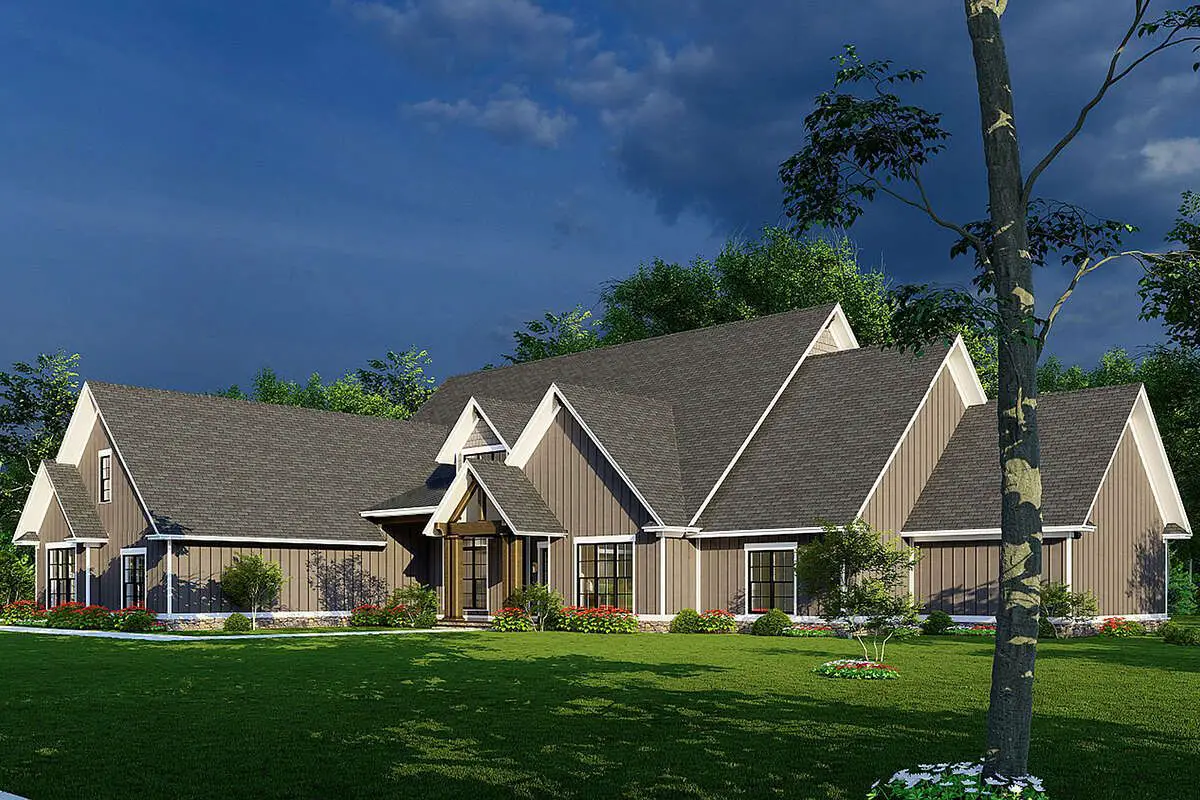 Large windows and layered roof pitches enrich the elevation with depth and architectural interest. This design works beautifully in suburban, countryside, or wooded settings alike, adapting well to landscapes where outdoor living and curb appeal matter.