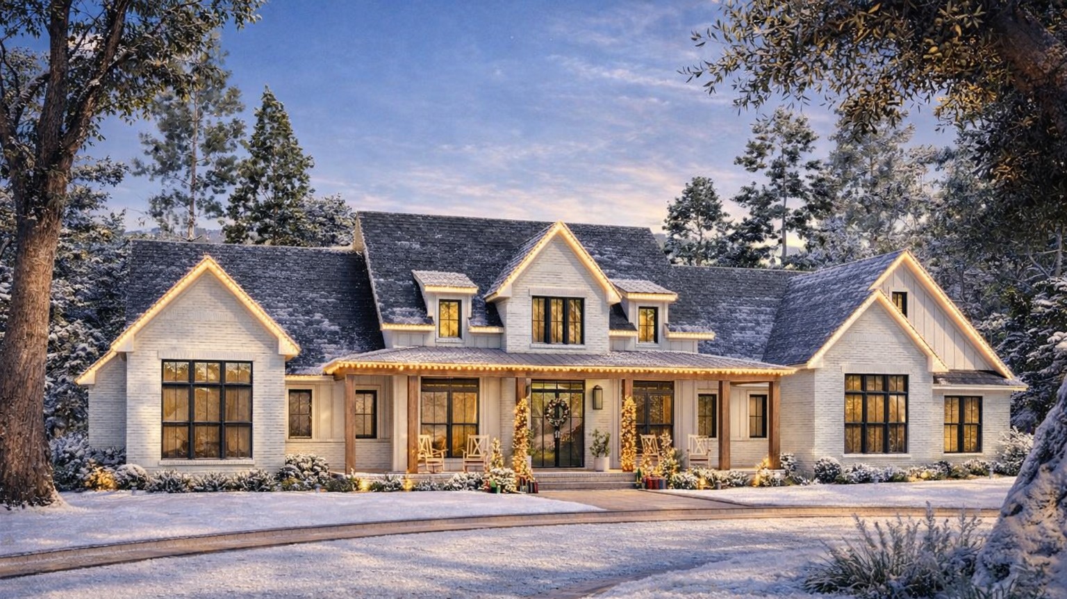 The exterior showcases a classic modern farmhouse aesthetic — typically white brick with warm timber accents — creating welcoming curb appeal with a grand front porch perfect for morning coffee or greeting guests.