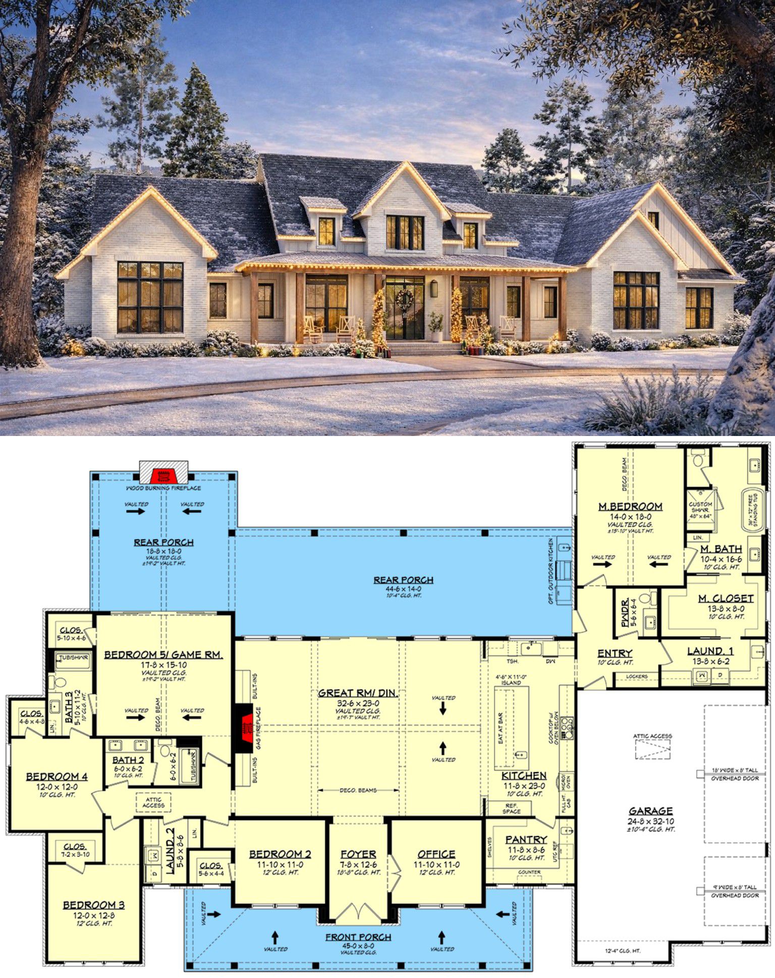 This Grand Modern Farmhouse plan is crafted for families who want a home that balances open, connected gathering spaces with plenty of privacy and functional zones. The inclusion of a dedicated home office, split bedroom layout, and flexible game room expands its usability for work, play, and relaxation. The expansive rear porch with a full outdoor kitchen and fireplace makes it especially appealing for outdoor entertaining and year-round enjoyment. 20