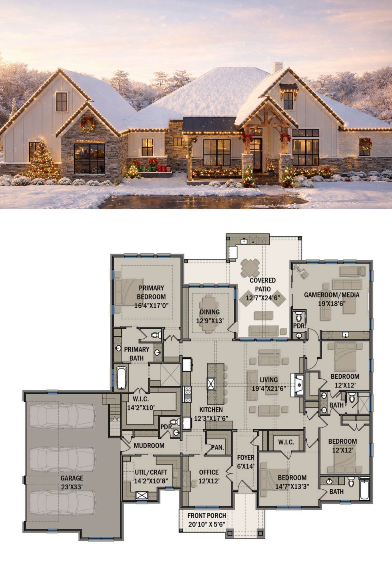This modern farmhouse plan suits families looking for a blend of open, connected living spaces and well-defined private areas. With generous living zones, thoughtful bedroom placement, and multiple bathrooms, it supports busy routines and hosting with ease.