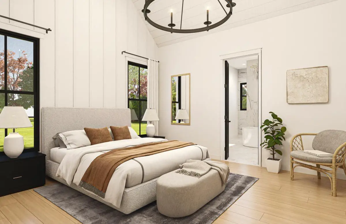 The primary suite is situated in its own wing to offer maximum privacy and quiet. It includes a generously sized bedroom, a spa-like ensuite bathroom with dual vanities, separate shower and tub, and large walk-in closets. This suite is designed to be a restful retreat at the end of the day — easy to access from the main living areas while remaining separate from the secondary bedrooms.