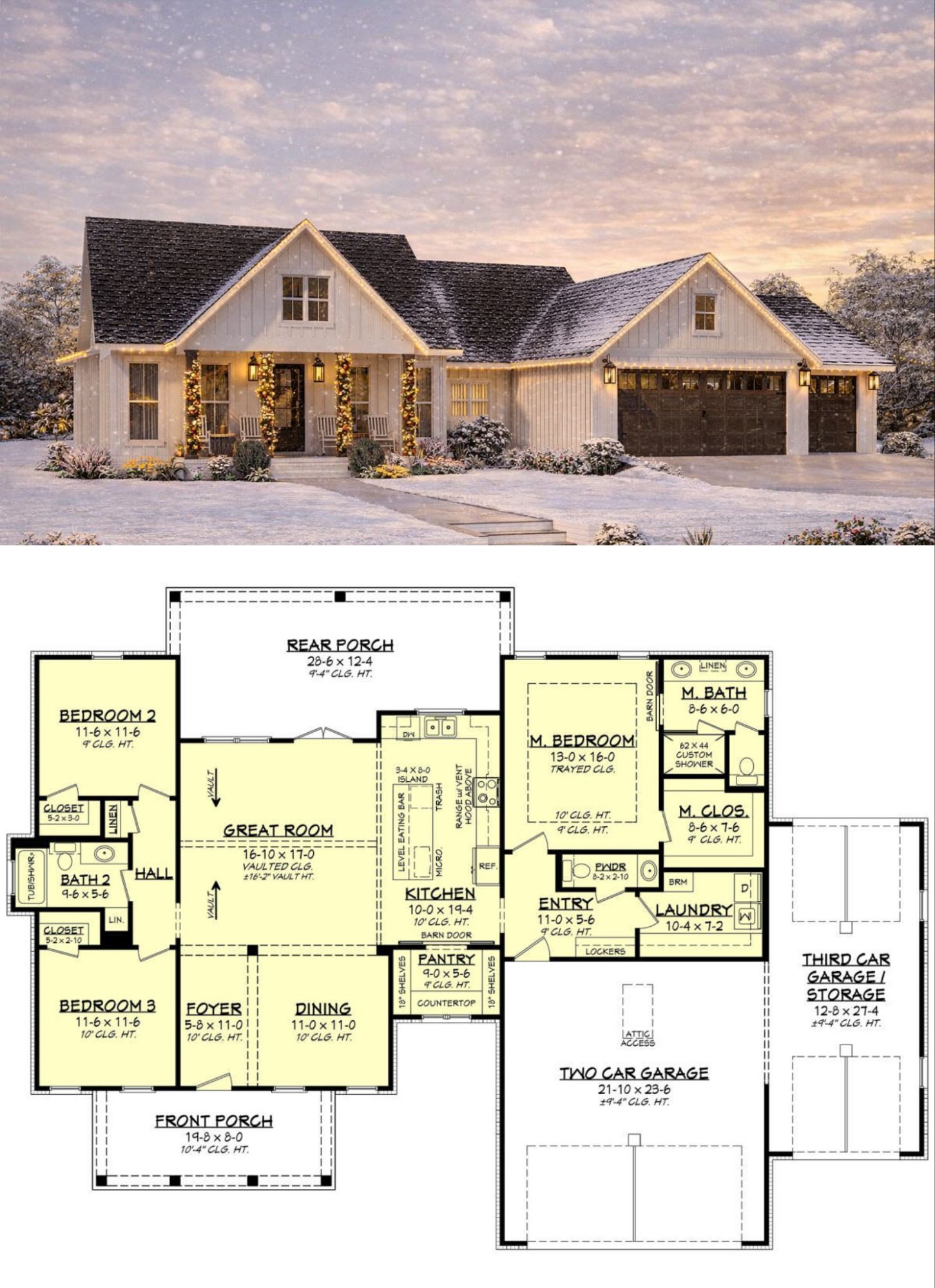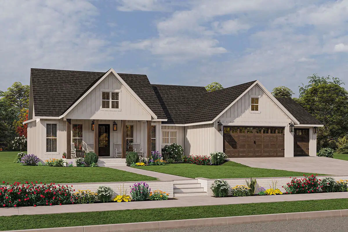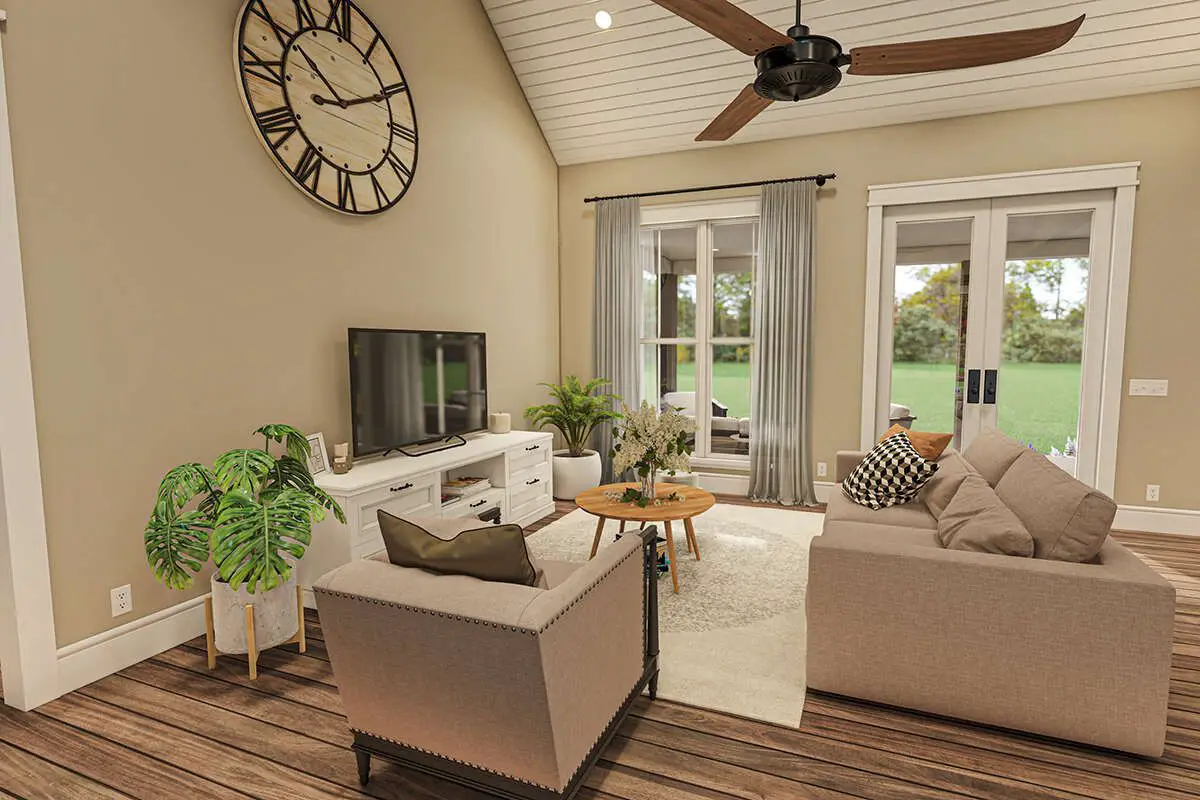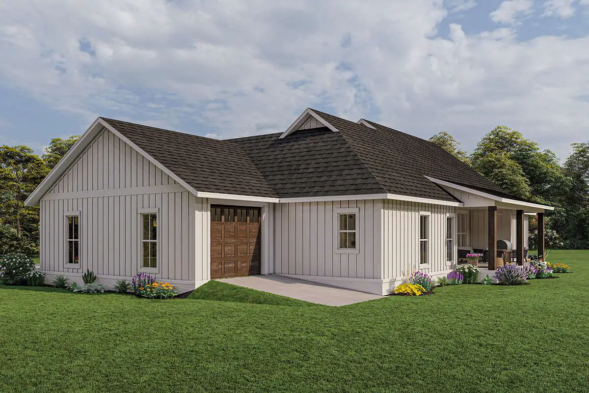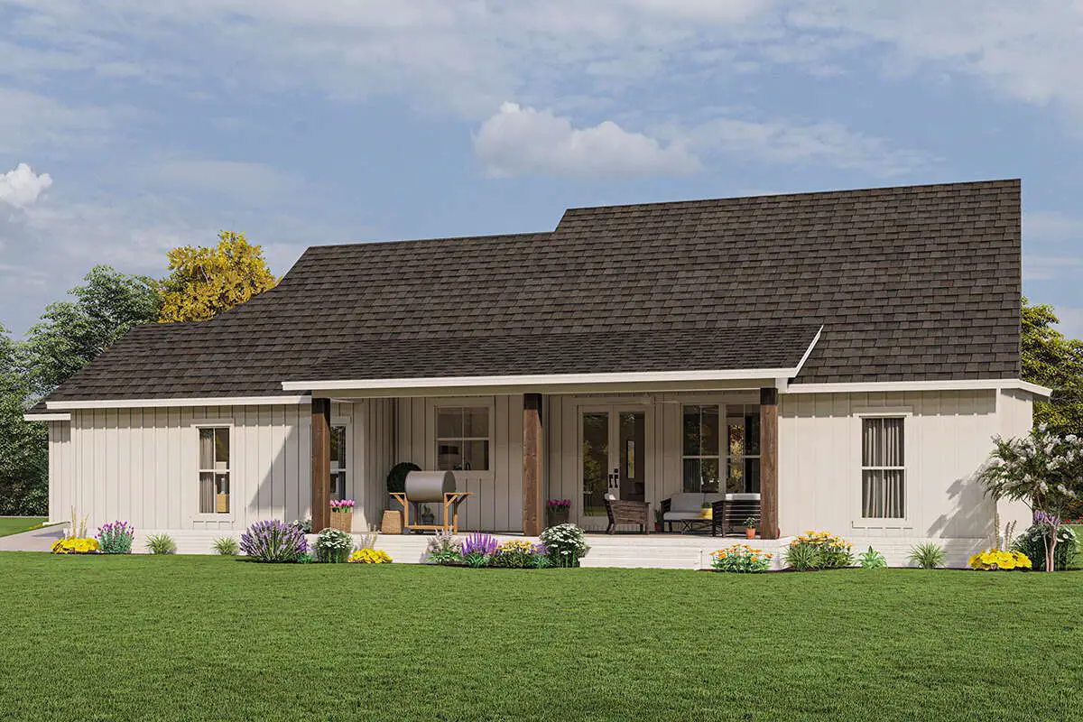 This modern farmhouse plan balances open communal spaces with well-defined private areas. The open floor plan supports interaction between the kitchen, dining area, and living room — ideal for family gatherings and entertaining — while the bedroom layout ensures comfort and independence for every occupant. The vaulted living space enhances light and volume, making the interior feel much larger than its footprint.