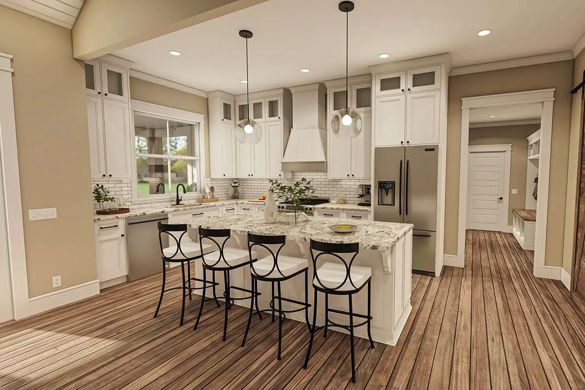 The kitchen is designed to be social and functional, with a central island that provides prep space, casual seating, and a natural place for family interaction. Storage and organization are enhanced with nearby pantry space, helping keep counters clear and routines smooth.