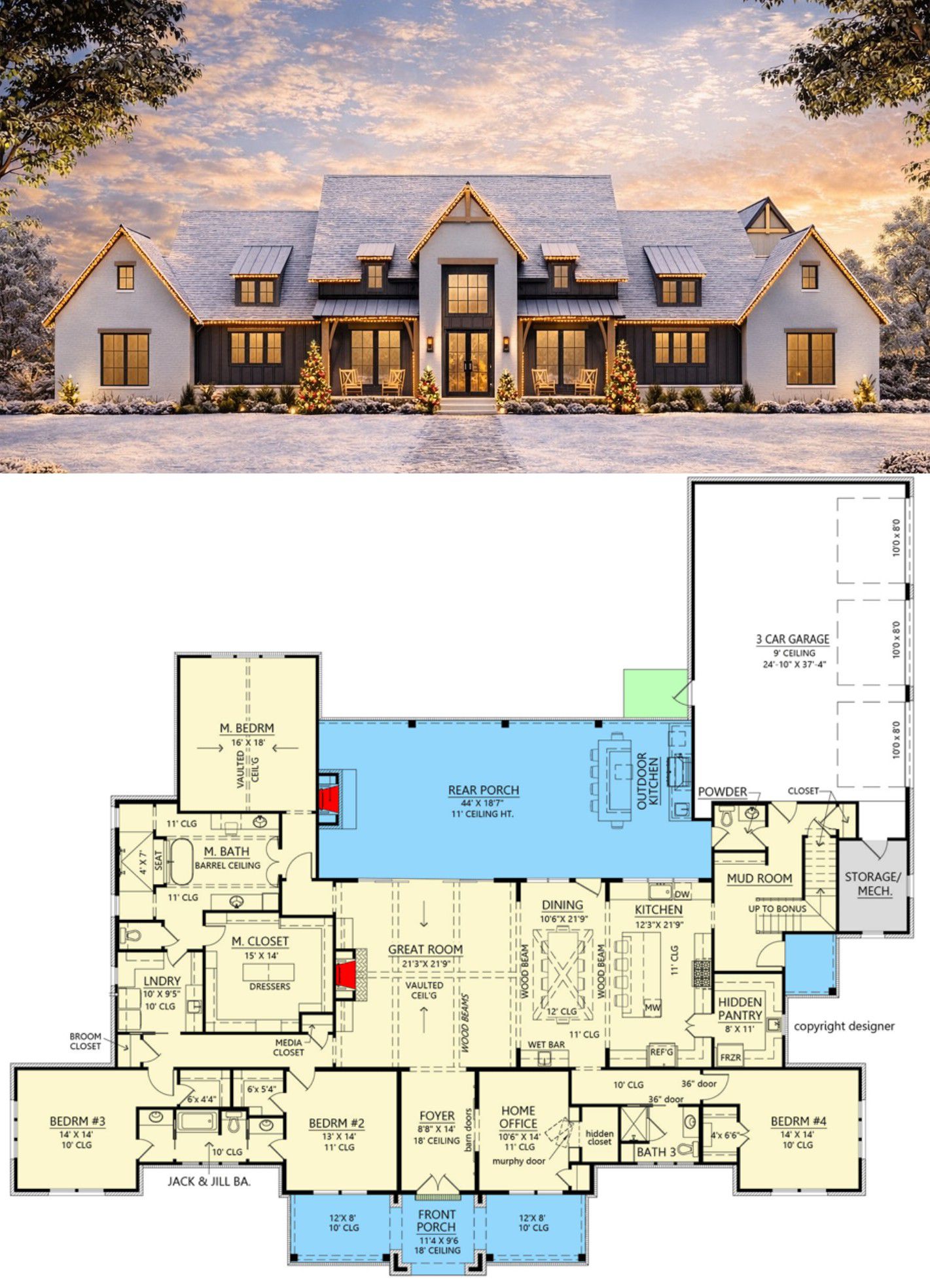 This plan suits families who enjoy modern open living and classic farmhouse charm. It’s ideal for homeowners who want welcoming social spaces, comfortable private retreats, and functional everyday conveniences without sacrificing style. With generous porch areas and flexible options built into the layout, it feels inviting for daily life and ready for hosting friends and family.