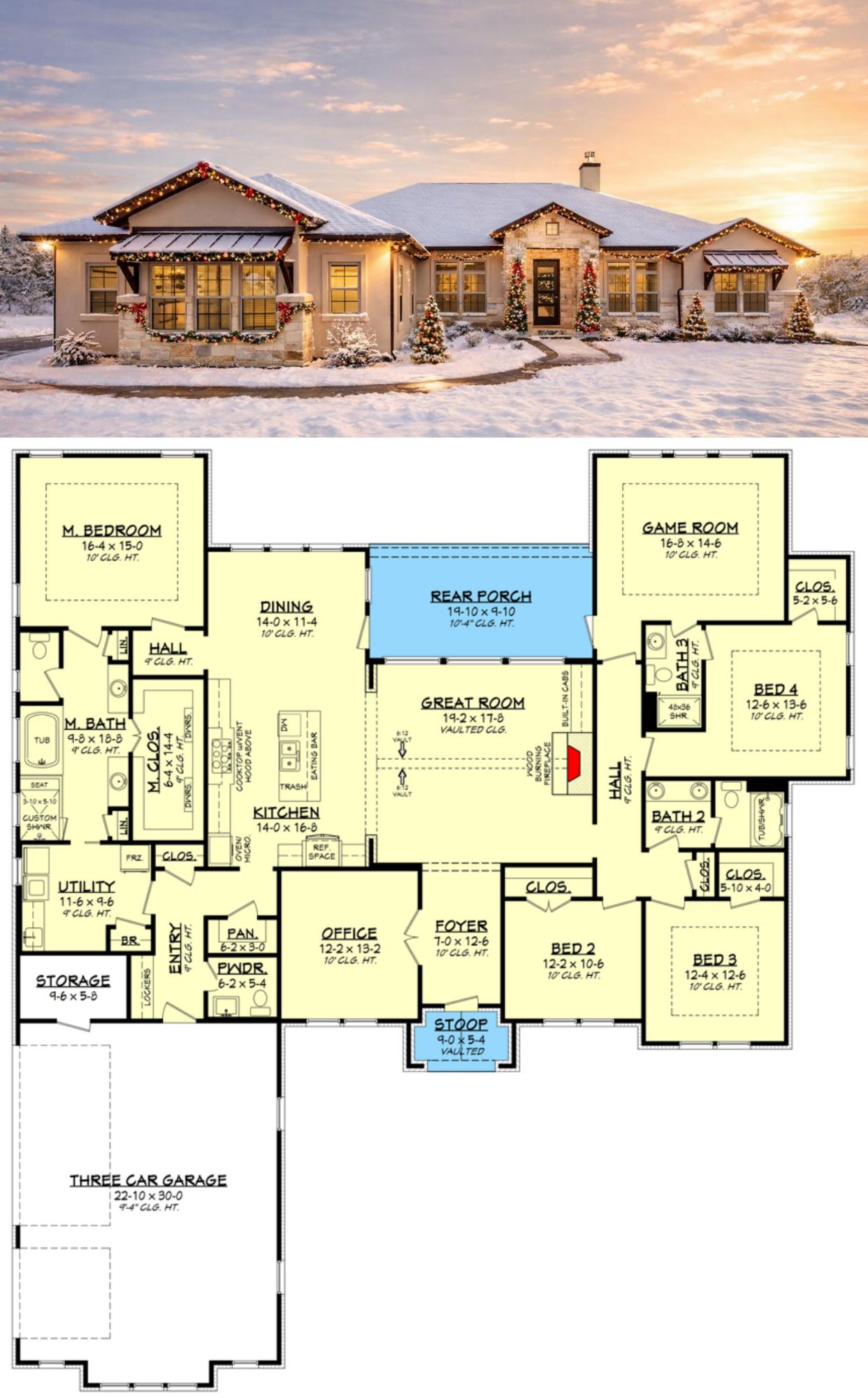This Texas-style ranch plan blends open, connected living with smart separation between public and private spaces. The vaulted great room creates an airy central gathering area, while the thoughtful placement of bedrooms, the game room, and office ensures both comfort and flexibility. Wide openings and oversized windows bring natural light deep into the home, enhancing the sense of space and comfort. 12
