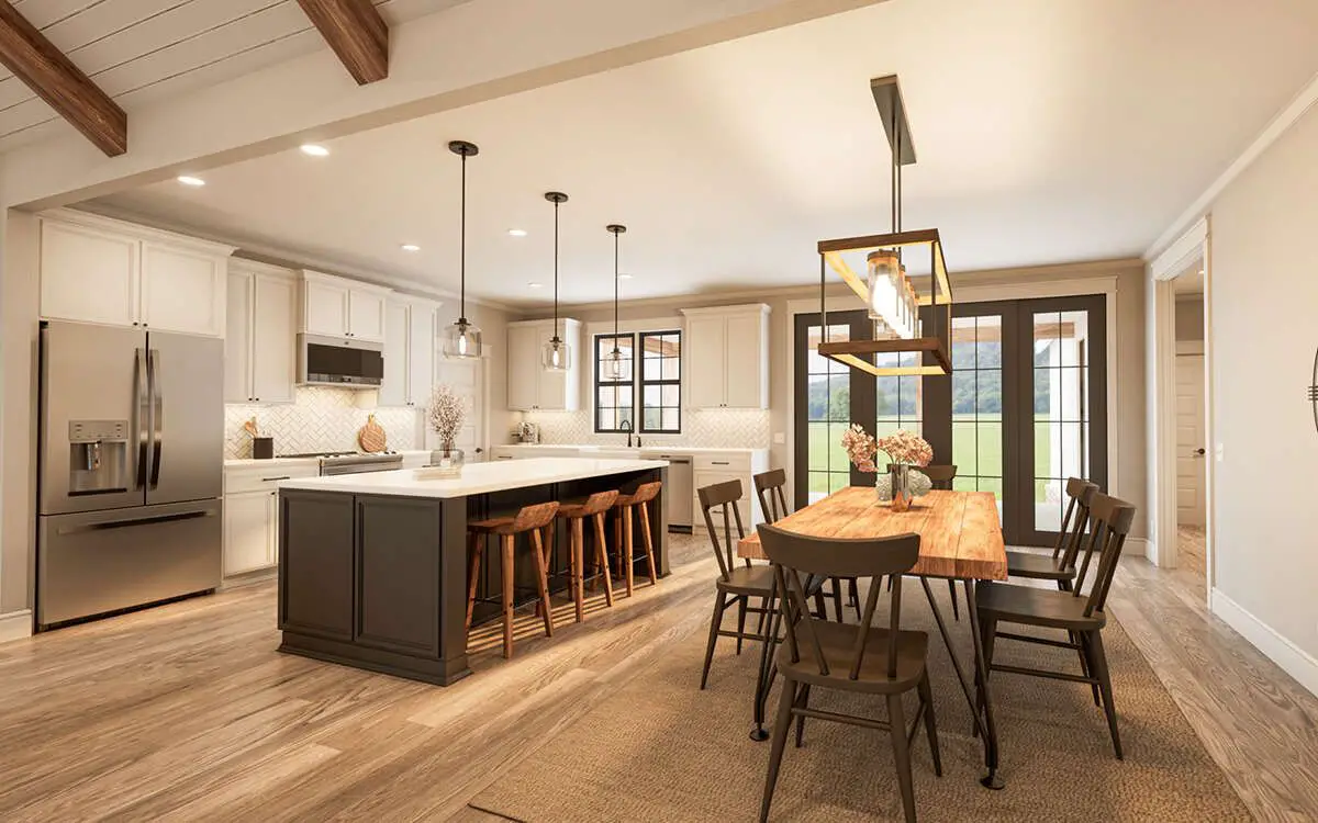 This modern farmhouse plan balances open gathering spaces with private retreats, making it versatile for everyday living and entertaining. The main gathering zone invites connection between kitchen, dining, and living areas, while bedrooms remain comfortable and private. 20