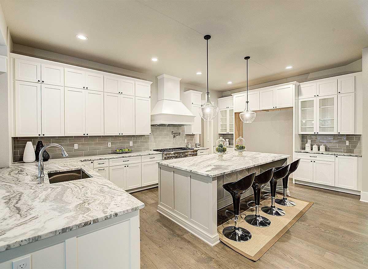 The **kitchen** is designed for both style and function, featuring a large central island with seating for casual meals and conversations. Ample counter space and cabinetry provide storage and work area, while easy access to the dining space ensures smooth flow during family meals and dinner parties. A walk-in pantry keeps essentials organized and accessible.