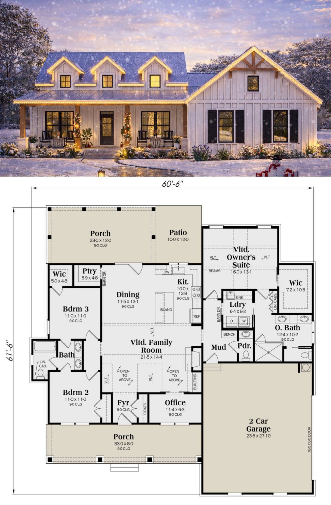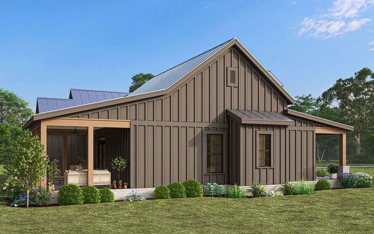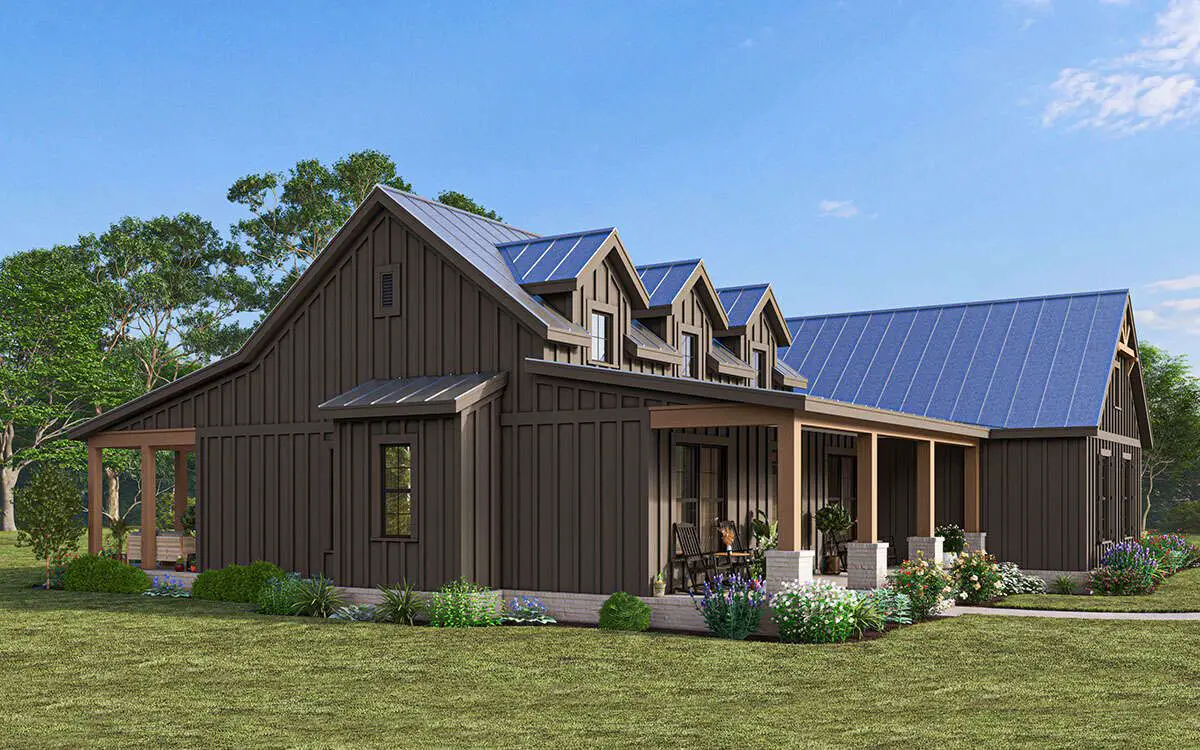 The exterior features clean, modern farmhouse lines with board-and-batten siding and simple yet striking gables. A generous front porch (~264 sq ft) invites relaxed living and adds to the home’s warm, welcoming presence.