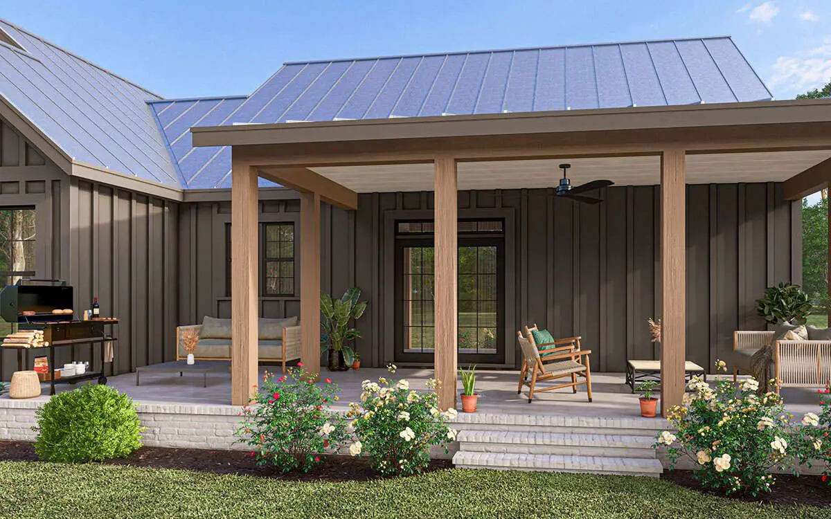 This modern farmhouse plan is designed to support everyday living with ease. The open main living spaces keep family and guests connected, while the thoughtful bedroom placement ensures quiet and privacy when needed. Combined porch spaces extend the home’s footprint outdoors, enhancing everyday comfort and entertaining options.