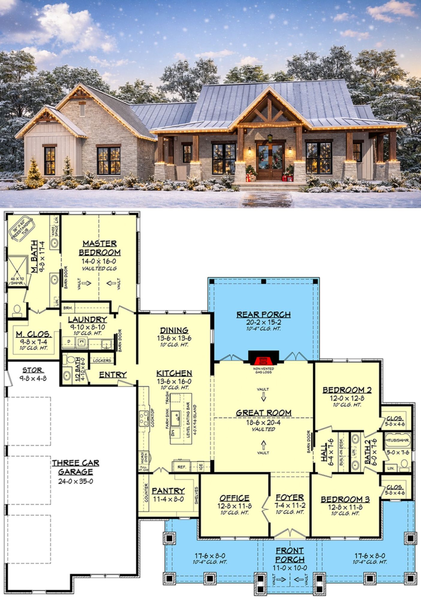 - Ceiling Heights: 9′-4″ main level, 16′ vaulted great room and master suite