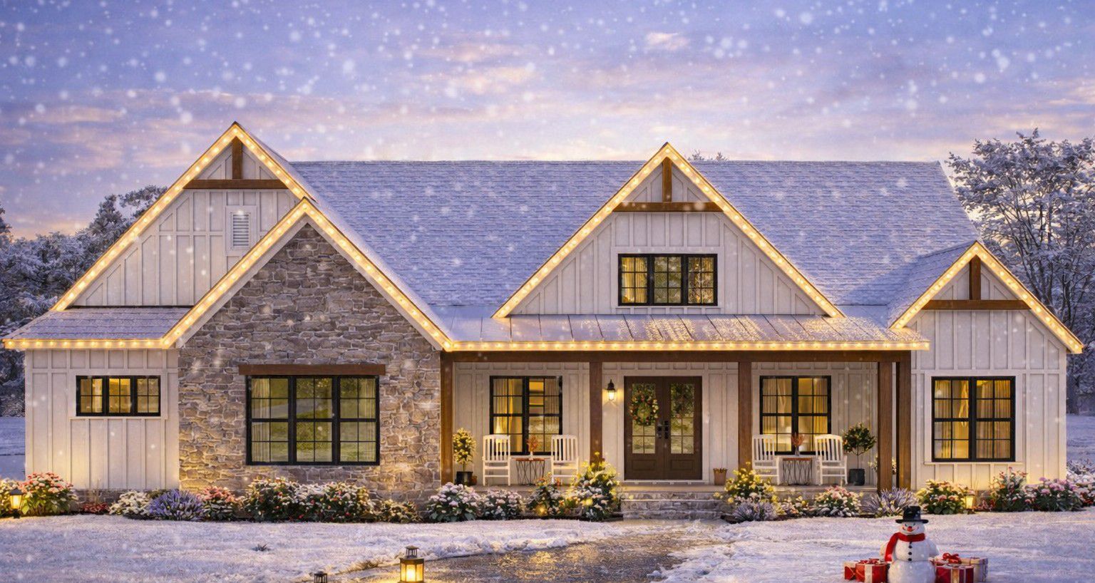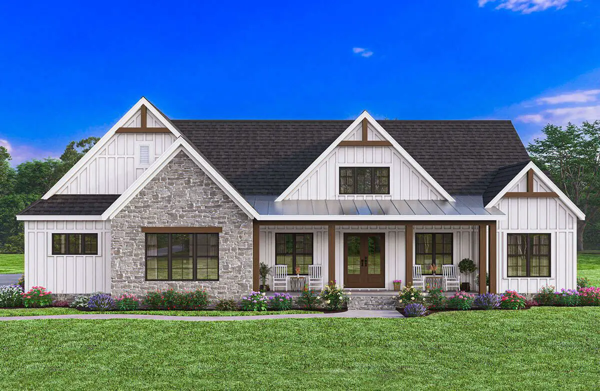 The exterior showcases classic modern farmhouse lines—clean gables, board-and-batten siding, and a welcoming symmetrical façade that complements many settings from rural parcels to suburban lots.