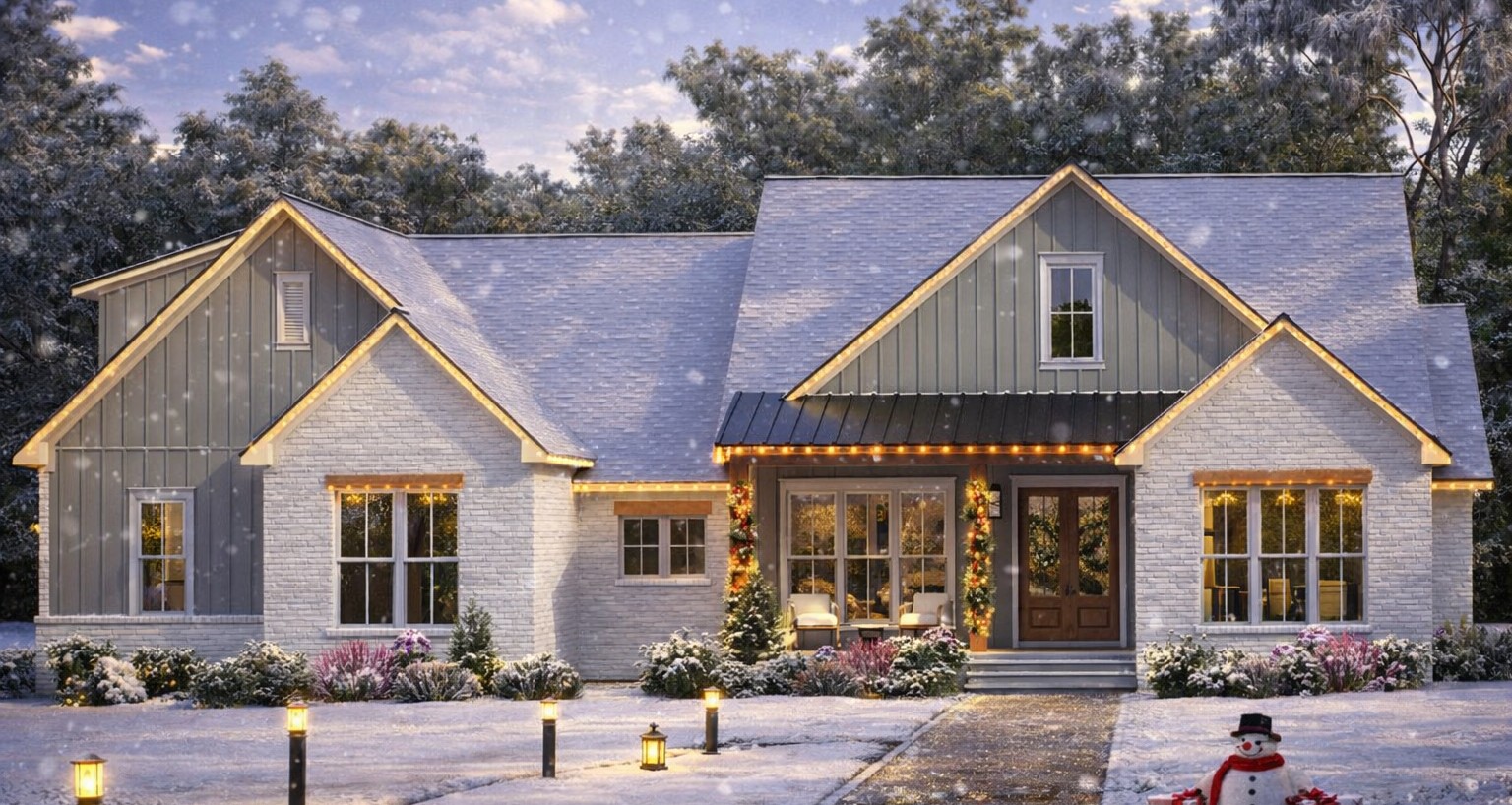 The exterior features classic modern farmhouse styling with clean lines, balanced gables, and board-and-batten accents that create a welcoming façade.