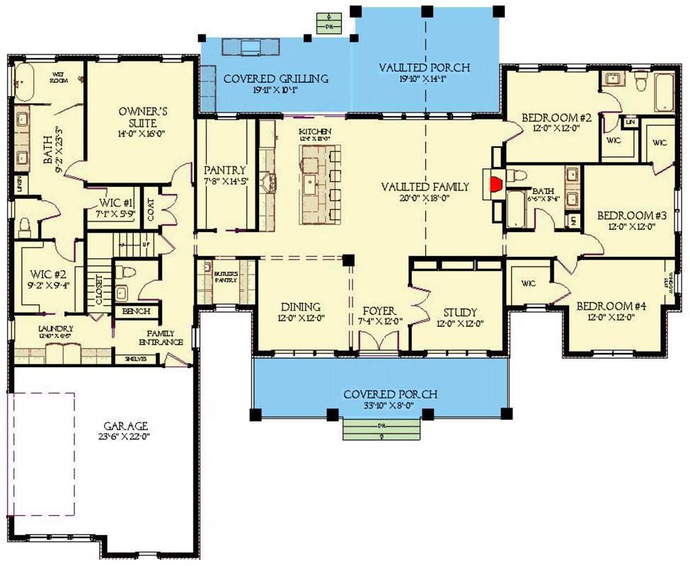 This plan provides four main-level bedrooms, thoughtfully positioned to balance shared living areas with personal privacy. The master suite sits apart from the secondary bedrooms, offering a peaceful retreat at the end of a busy day. 6