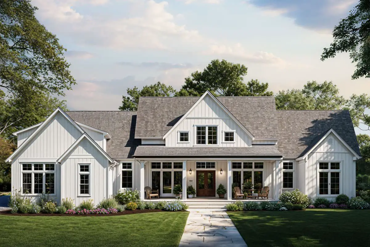 The exterior features the clean lines and welcoming simplicity that modern farmhouse style is known for. Board-and-batten siding and balanced gables combine with a covered front porch to create a façade that’s both relaxed and striking. With an 88′-3″ width and 53′-5″ depth, this home presents a strong street presence while still feeling inviting.