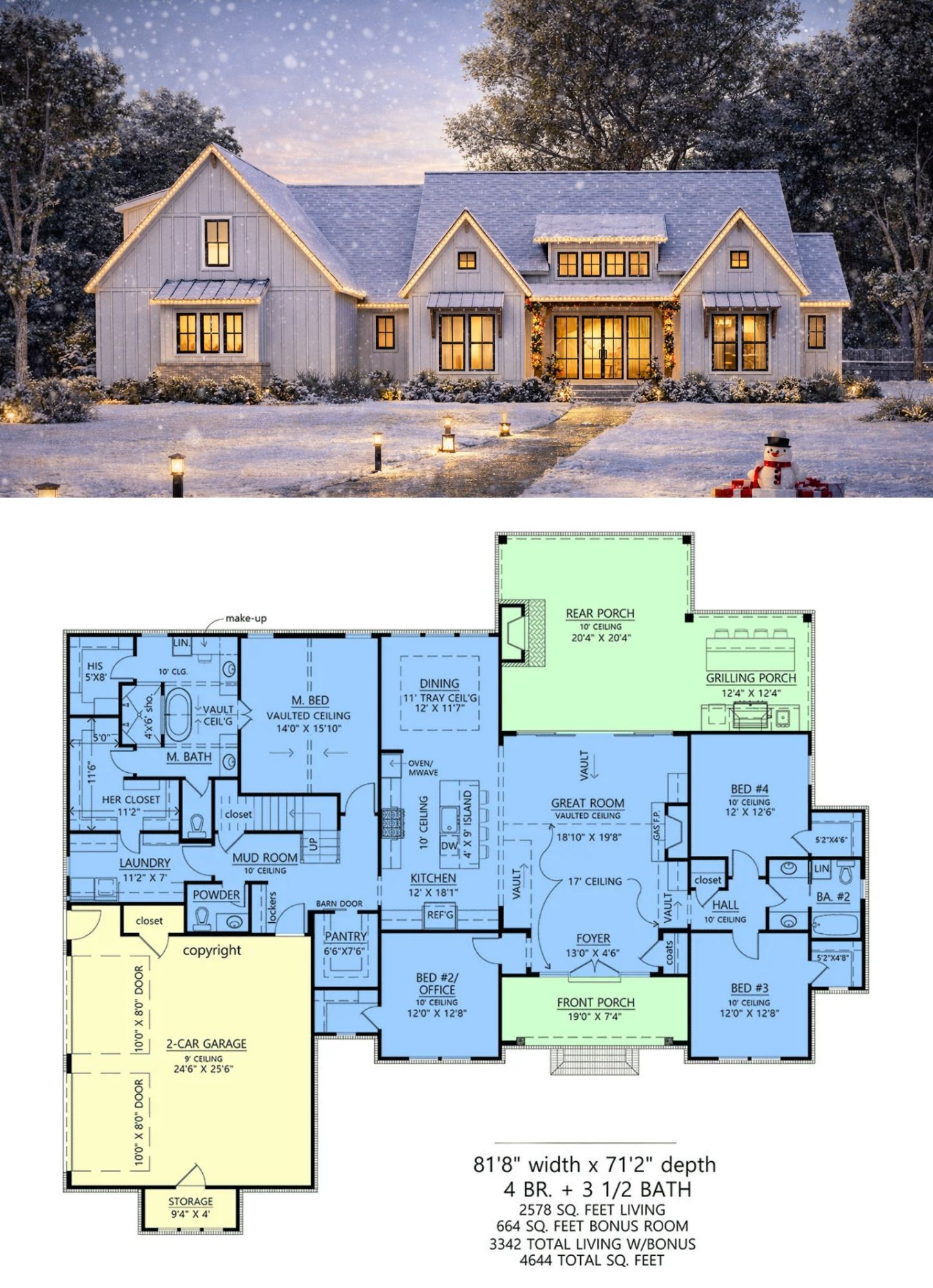 With roughly 2,578 square feet of primary living space, 4 bedrooms, 3.5 bathrooms, and a generous bonus room, it’s designed for families who love open gathering areas, private retreats, and indoor-outdoor living. The exterior has a fresh, bold farmhouse vibe that stands out without feeling trendy.