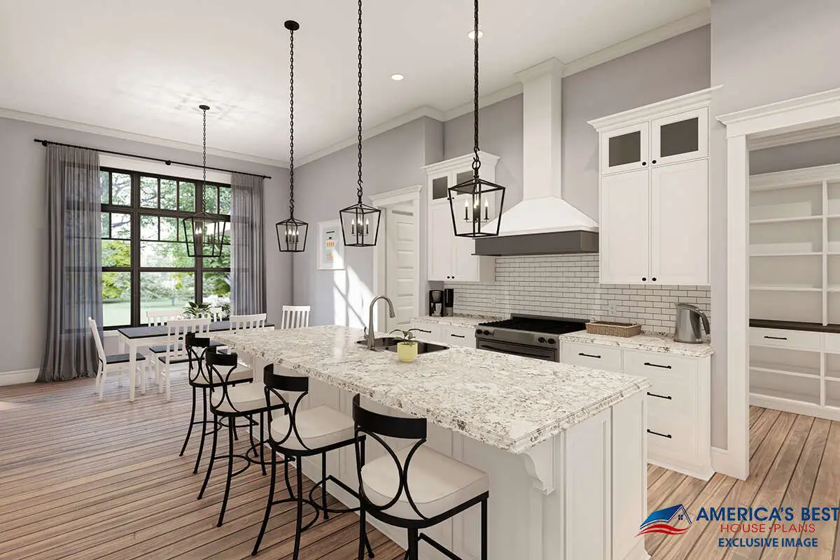 The kitchen is designed for both function and social life, often centered around an island that’s ideal for prep work, casual meals, and interaction with family or guests. Sightlines to living and dining areas help keep everyone connected.